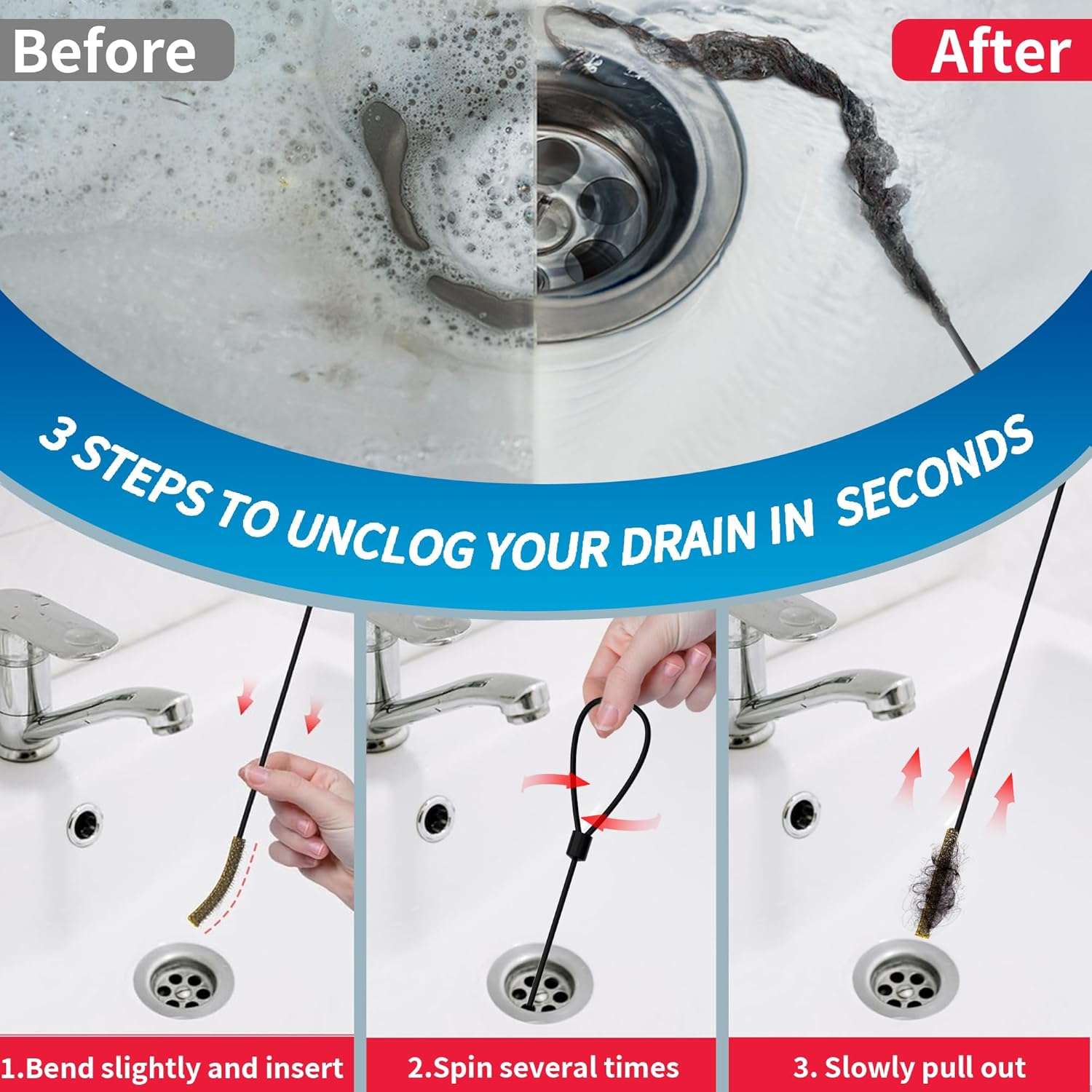 - Damage-free & Safety: Unlike chemical drain cleaners, the recyclable nylon-coated steel won't damage pipes & the environment. Safely clear blockages without corrosion risks or harmful residues. Maintain a clear bathtub, shower, and sink drain in minutes