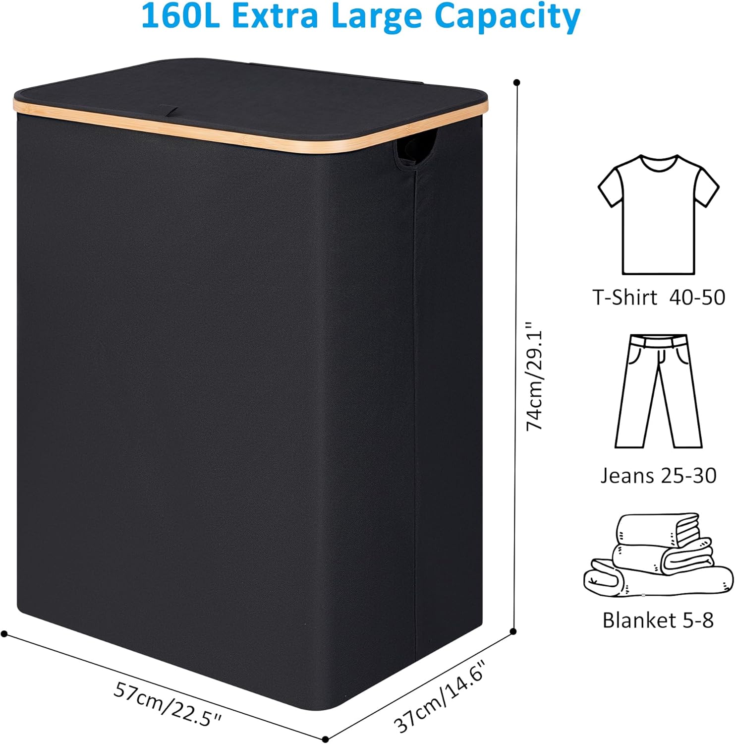 - This extra large laundry hamper measures 14.6''L x 22.4''W x 29.1''H. 160L collapsible laundry hamper is large enough to collect your towels or week's clothes.It is a good partener to help you keep your home clean and tidy.