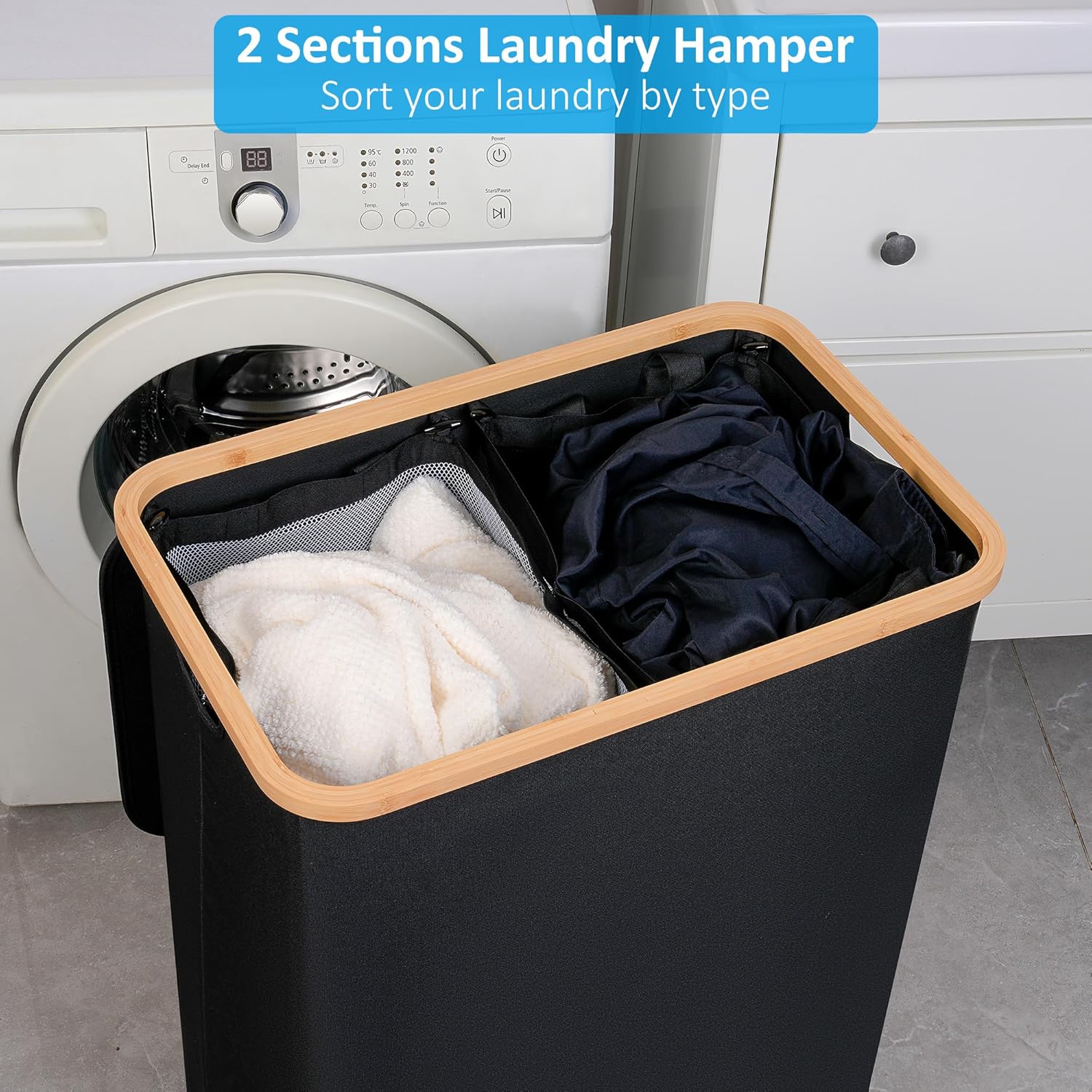 efluky Double Laundry Hamper with Lid, Divided Laundry Hamper with Removable Bags, 2 Section Dirty Clothes Basket with Handles for Bathroom, Bedroom & Laundry Room, 160L Black