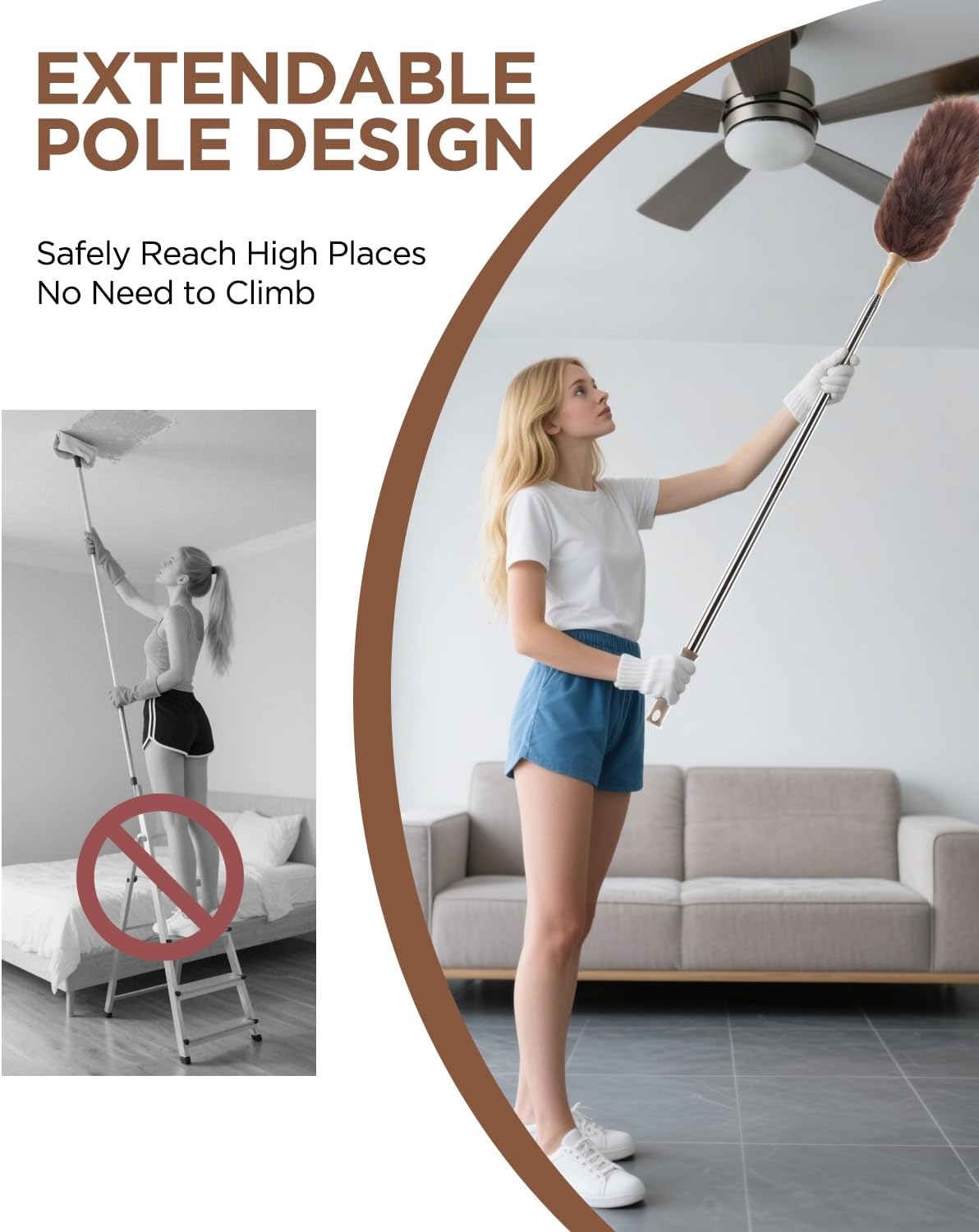 Extendable Lambswool Duster 30-100 Inch, Stainless Steel Long Handle Duster, Natural Feather Duster for Cleaning High Ceilings, Fans, Bookshelves, Interior, Cars