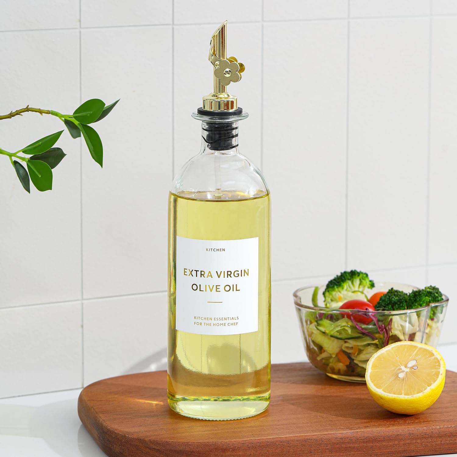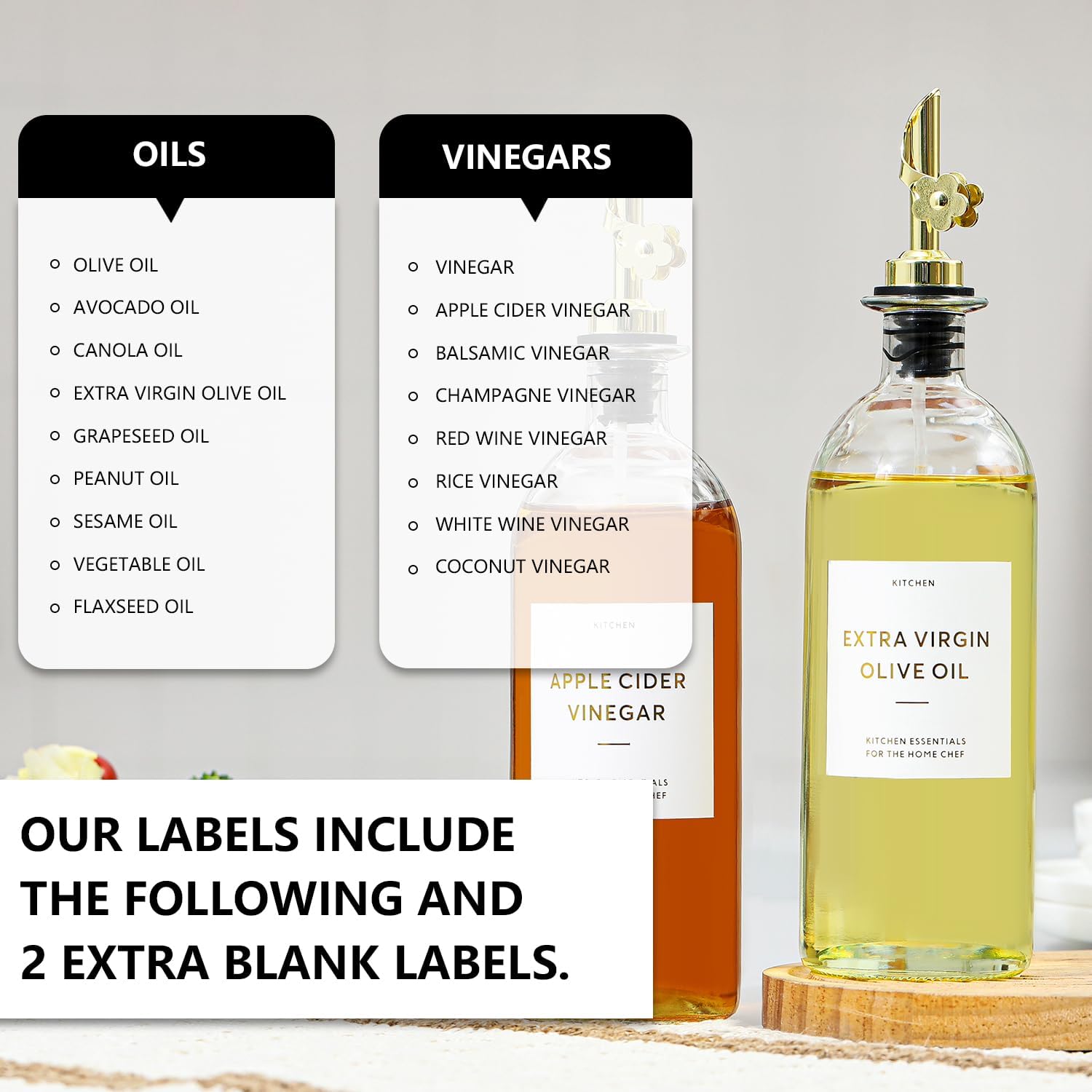 - KITCHEN OLIVE OIL BOTTLES – The oil and vinegar dispenser set contains 2 transparent 16oz (500ML) glass bottles, 2 gold stainless steel oil spouts, 17 gold waterproof labels(kinds of oil and vinegar) and a bamboo tray, Ideal for safely store and dispense your olive oil and vinegar.
