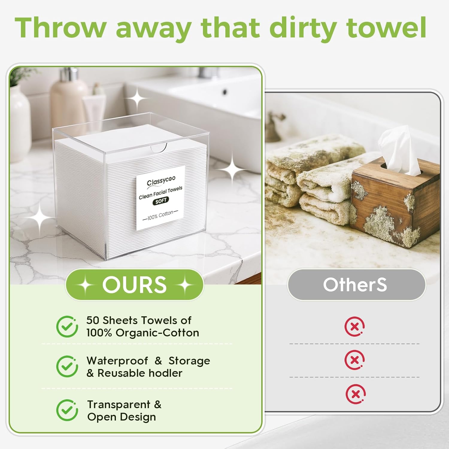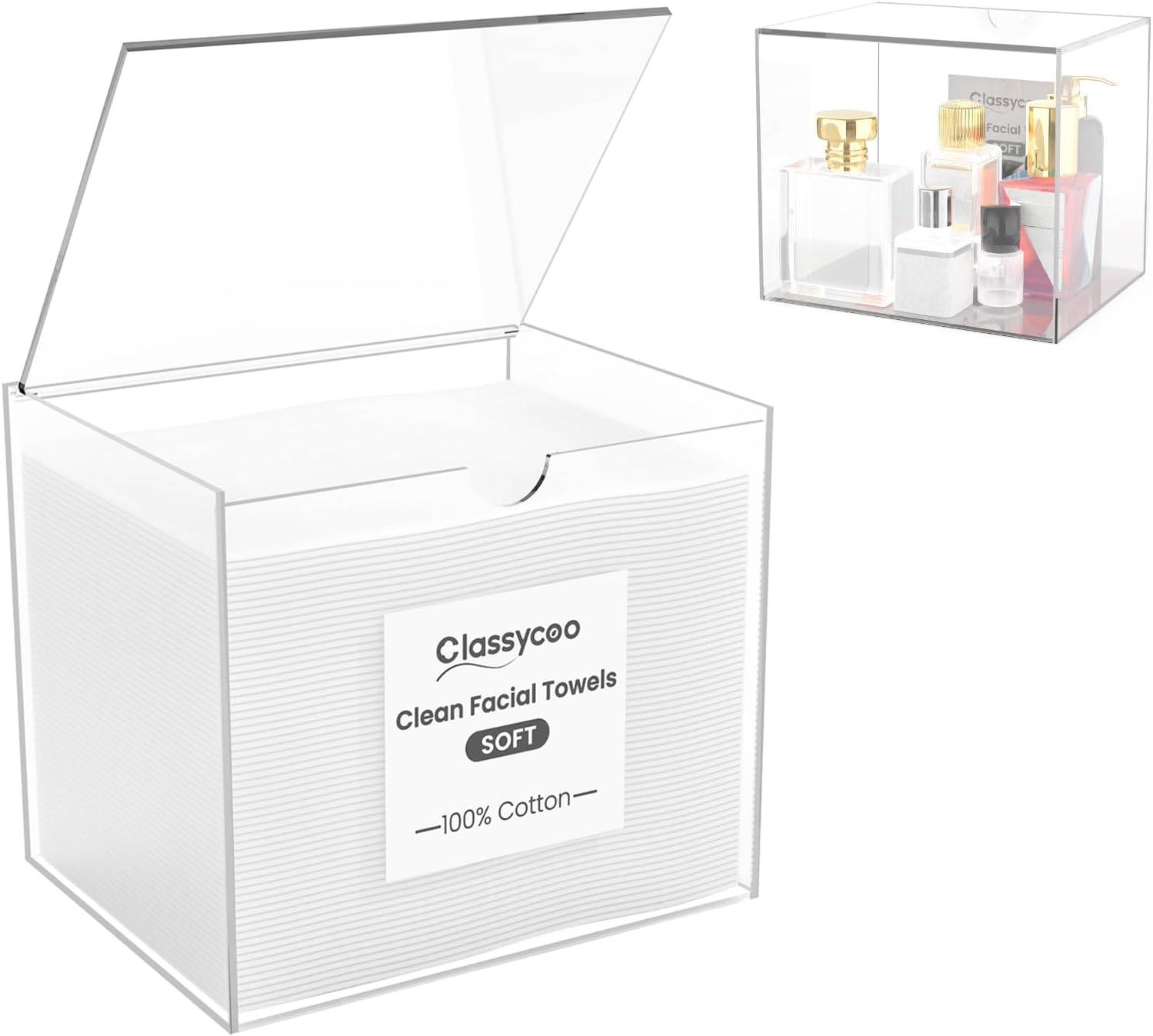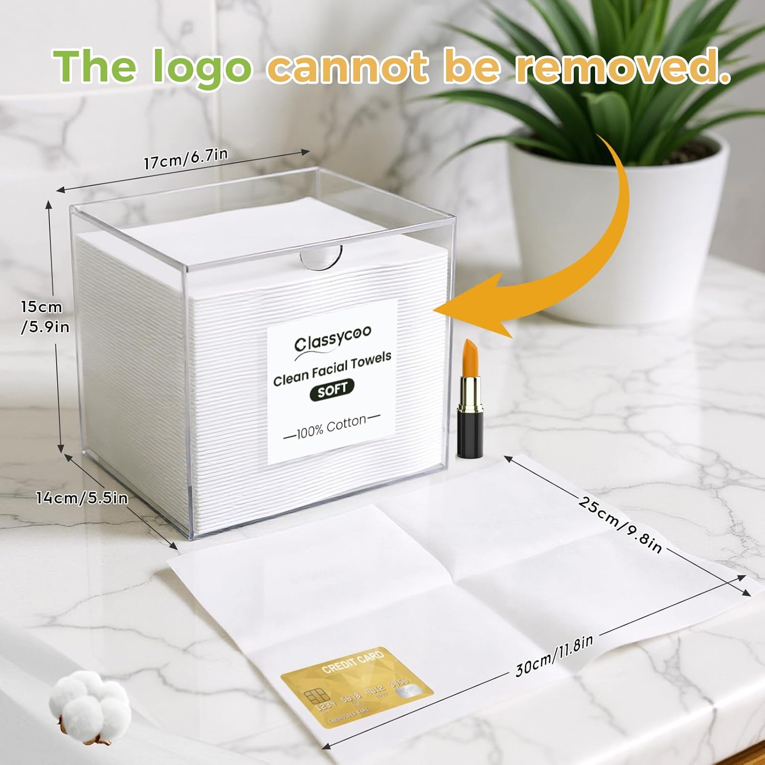 - 100% Cotton Facial Wipe & Premium Acrylic Material: 6.7"L x 6"W x 5.51"H, the face towel holder is compatible with CLEAN SKIN CLUB, Classycoo, etc. Note: Includes 50 PCS Facial Towels! This logo tag cannot be removed!