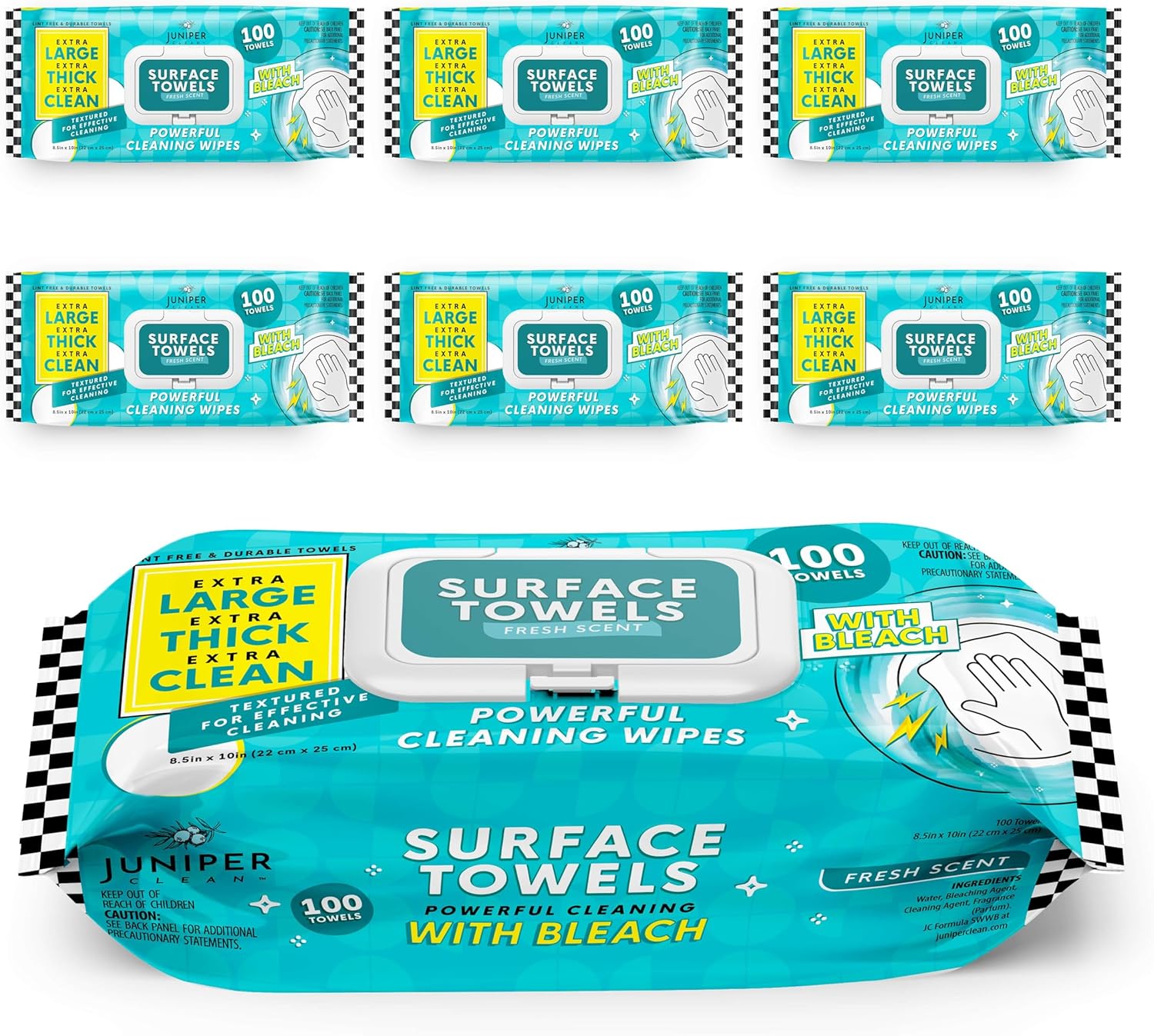 6 Packs Surface Wipes with Bleach, Thick & Large Dispose, All-Purpose Cleaner for Bathroom, Kitchen, Office, 600 Count Soft Flow, Biodegradable, Fresh Scent