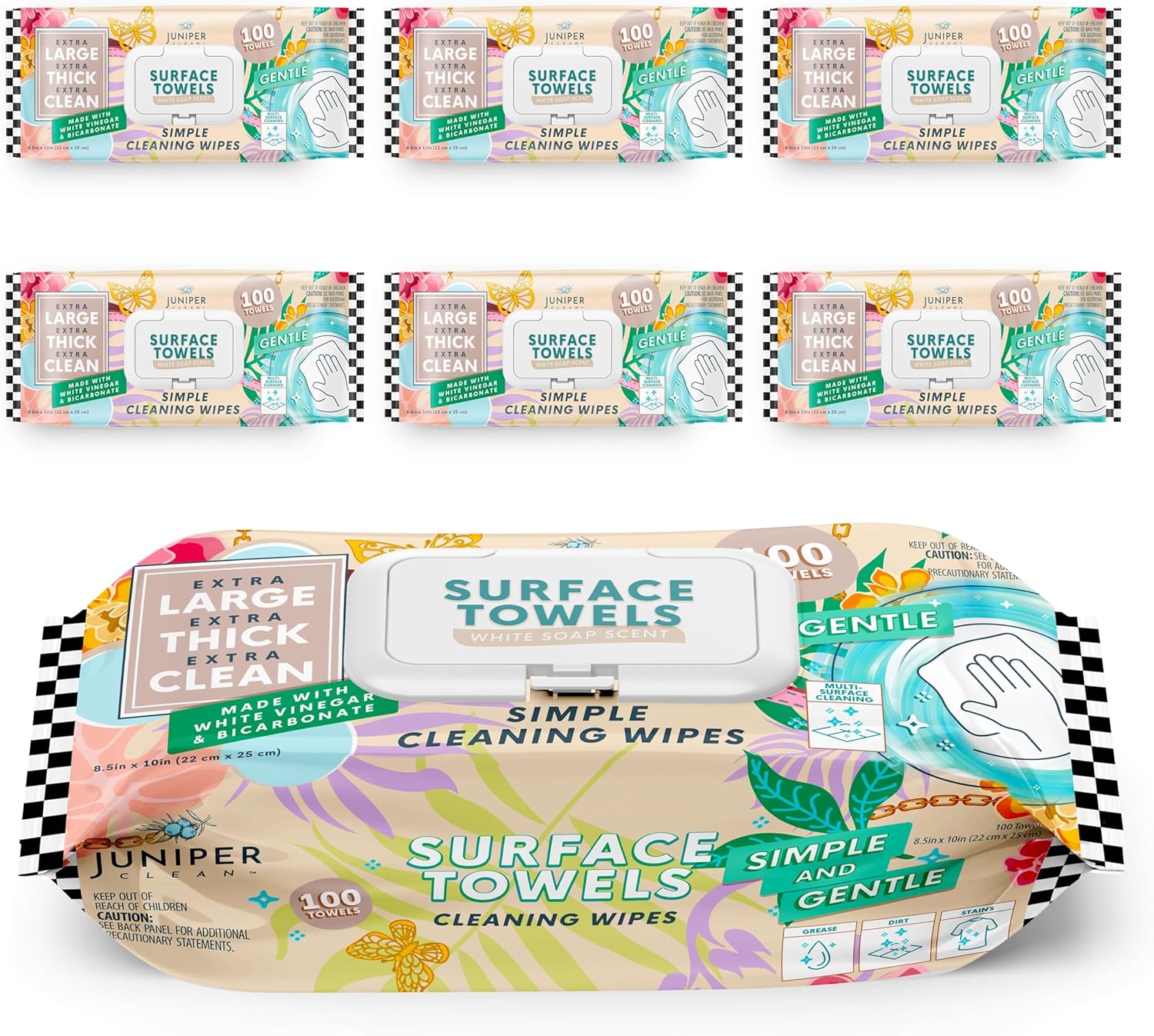 6 Packs Surface Cleaning Wipes, Thick & Large Dispose, All-Purpose Cleaner for Bathroom, Kitchen, Office, 600 Count Soft Flow, Biodegradable, White Soap Scent