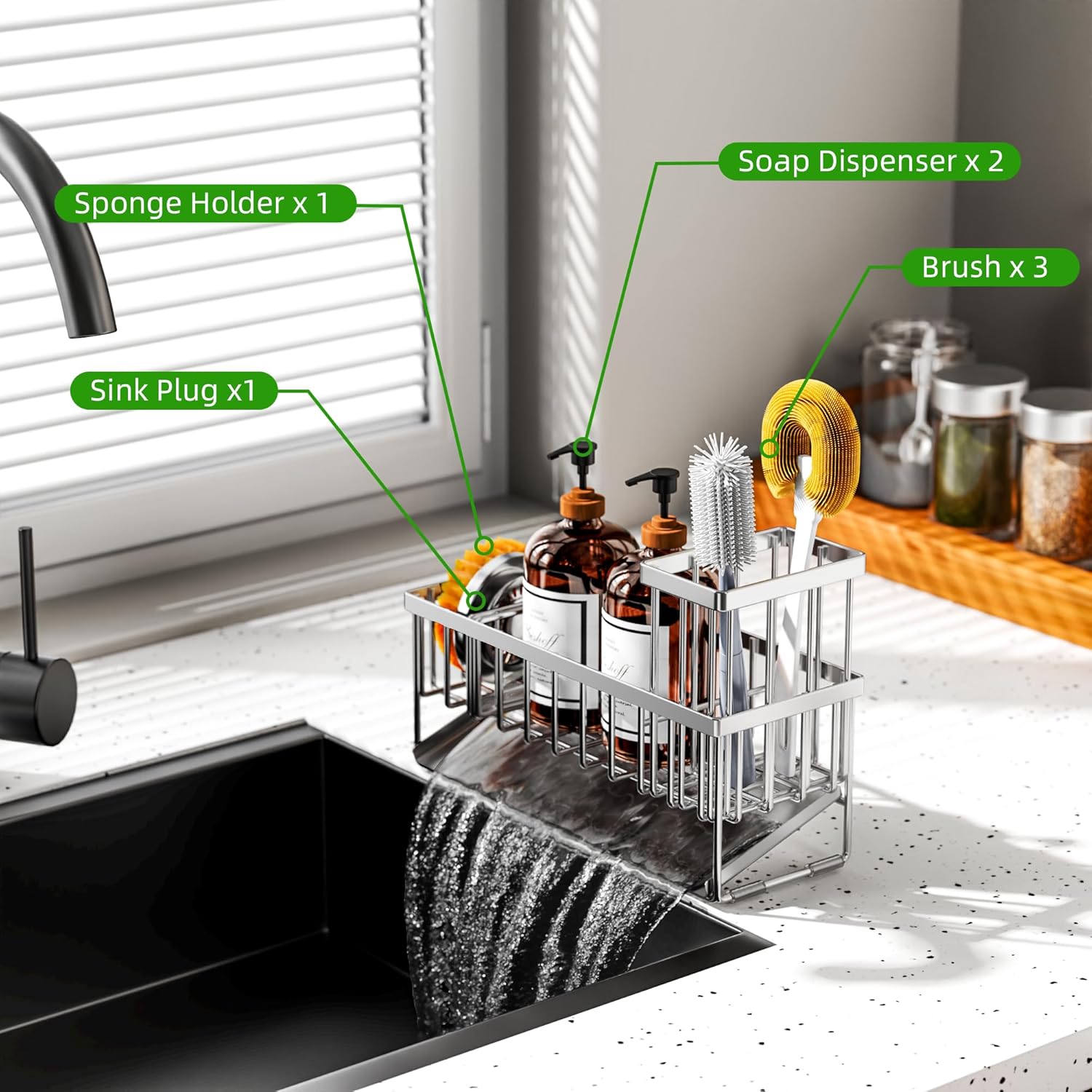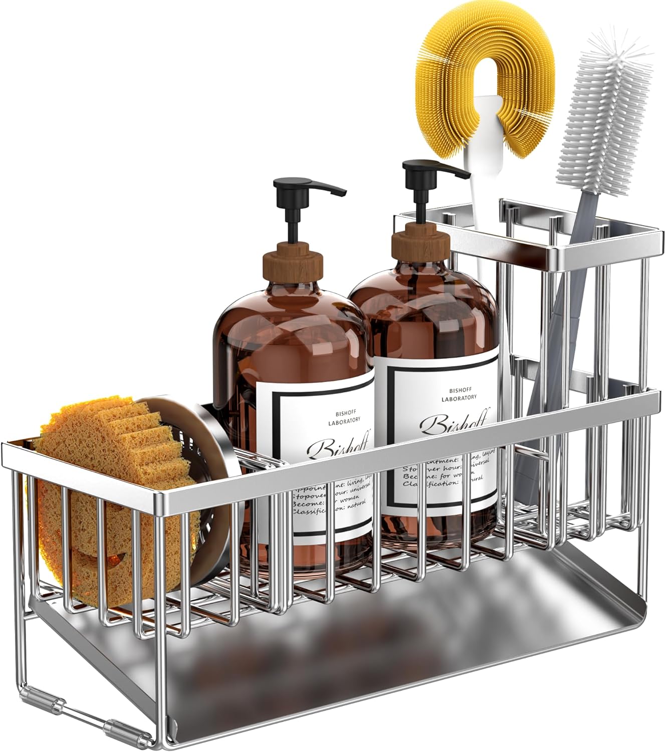 - 【EXTENDED AND LARGER CAPACITY】Cisily sponge holder has upgraded size. The size is only 10.62 inches * 3.97 inches * 6.37 inches, which can accommodate detergent bottles, sponge balls and sink plugs. Cisily sink organizer is additionally upgraded with a brush holder, which can hold up to 4 large and small brushes, perfectly saving countertop space.