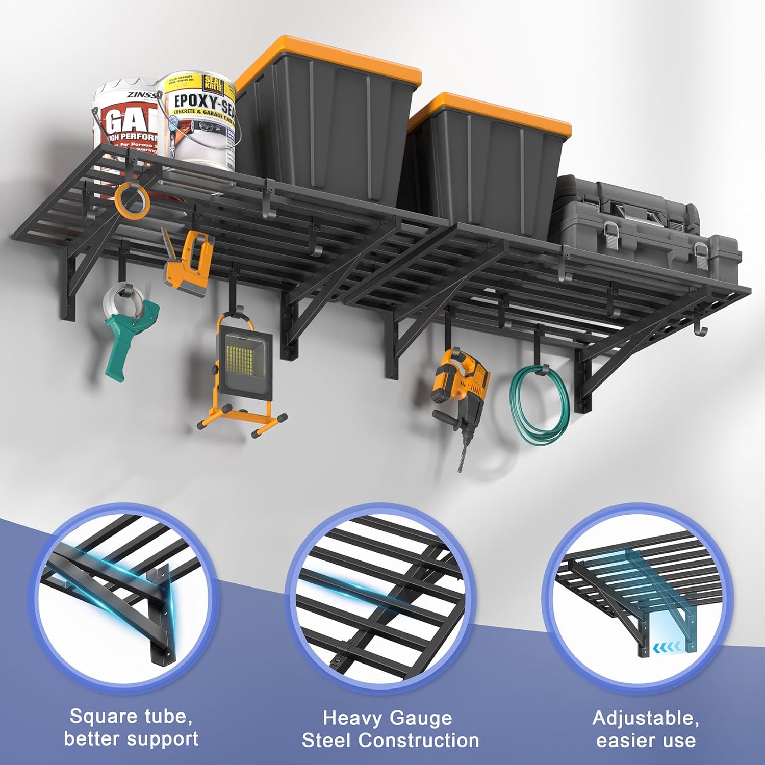 4-Pack 2x3ft Garage Shelving Wall Mounted, 2' x 3' Heavy Duty Garage Storage Shelves with Hooks, 800LB Capacity