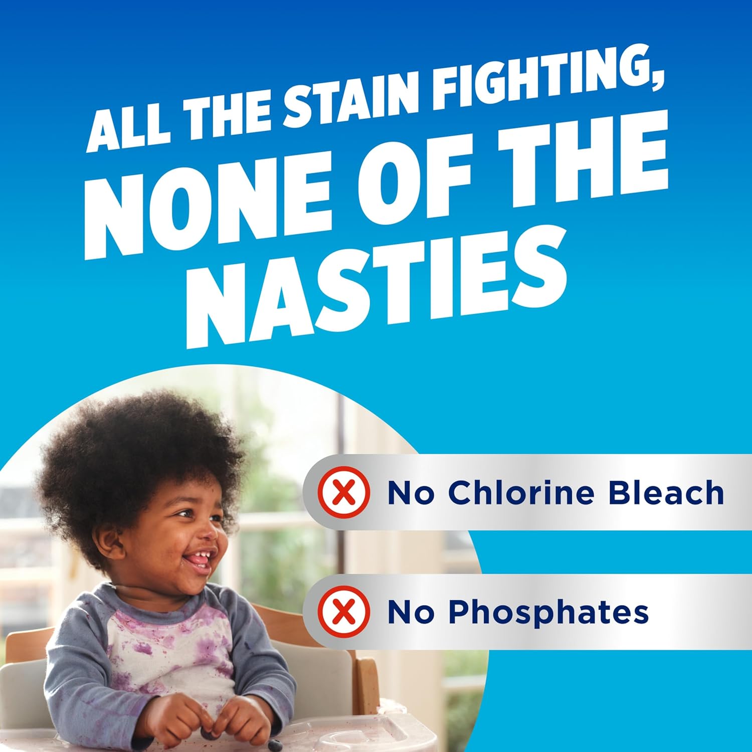 - TOUGH ON STAINS, GENTLE ON CLOTHES; this color-safe, oxygen-powered stain remover for clothes contains no chlorine bleach and no phosphates