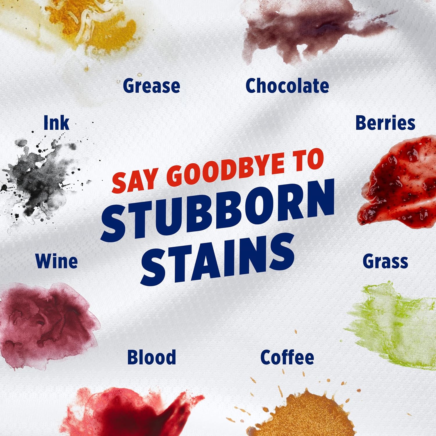 - HELP TACKLE SET-IN STAINS THE FIRST TIME; removes tough stains like oil, grease, coffee, wine, chocolate, ketchup, berries, fruit juice, grass, mud, blood, ink, and washable paint; with no extra pre-wash needed