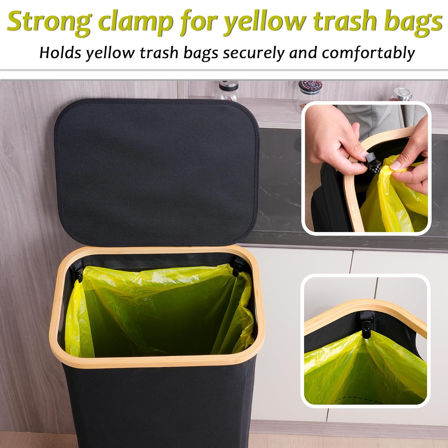 - 【Built-in Strong Clips】: The yellow garbage bag holder features four built-in strong clips that securely hold our garbage bags and can hold yellow garbage bags of different sizes. (Inner bag not included)