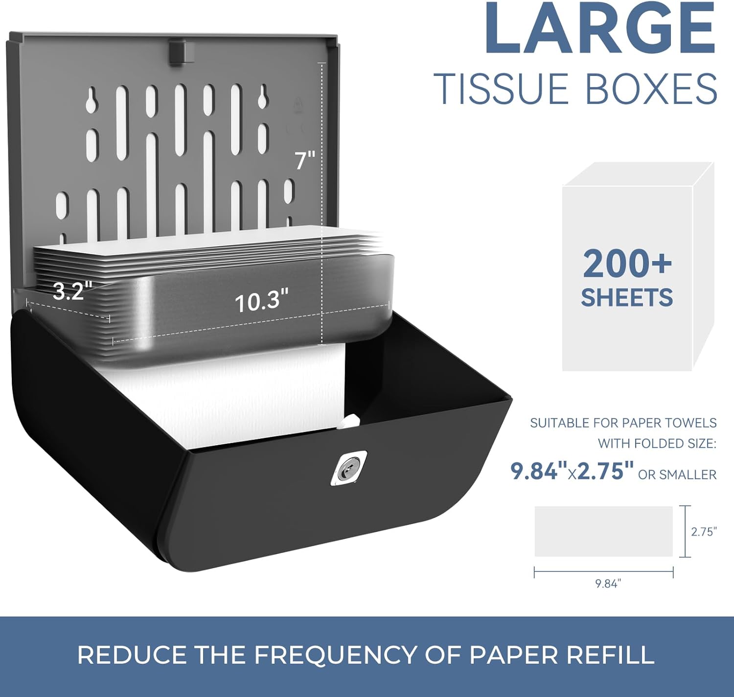 - 【Wide Compatibility & 200-Sheet Capacity】 Holds Most Standard C-Fold & Multi-Fold Paper Towels! Accommodates towels up to 10.2"L x 3.1"W(or smaller). The large capacity minimizes refill frequency, making it ideal for high-traffic areas. (Please Note: We recommend confirming your paper towel dimensions for optimal fit.)
