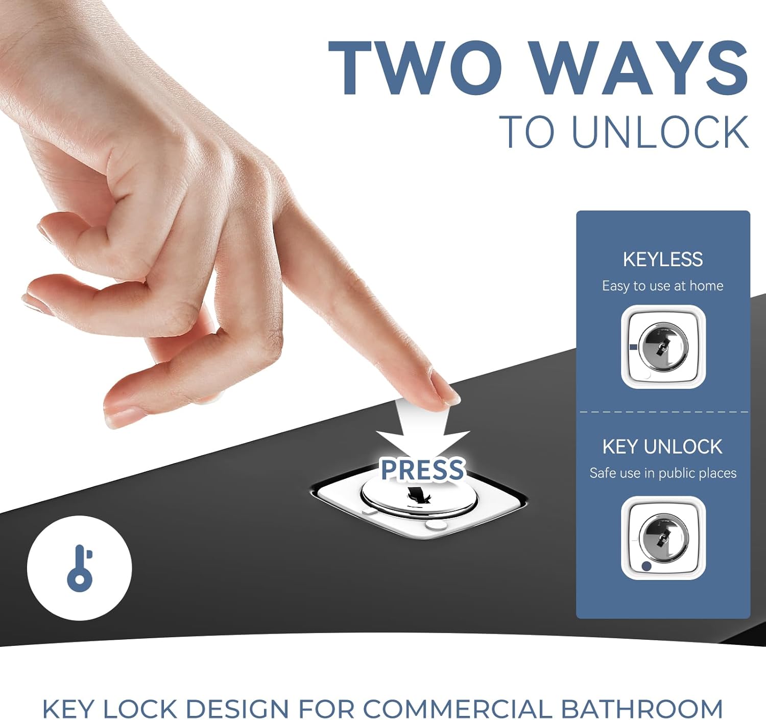 - 【Dual-Lock Security For Home & Business】 Press to Open for Home Use, Key-Lock for Commercial Spaces. This versatile paper towel holder offers a convenient push-button opening for your bathroom, and a secure key-lock mechanism for public restrooms, preventing theft and reducing waste.