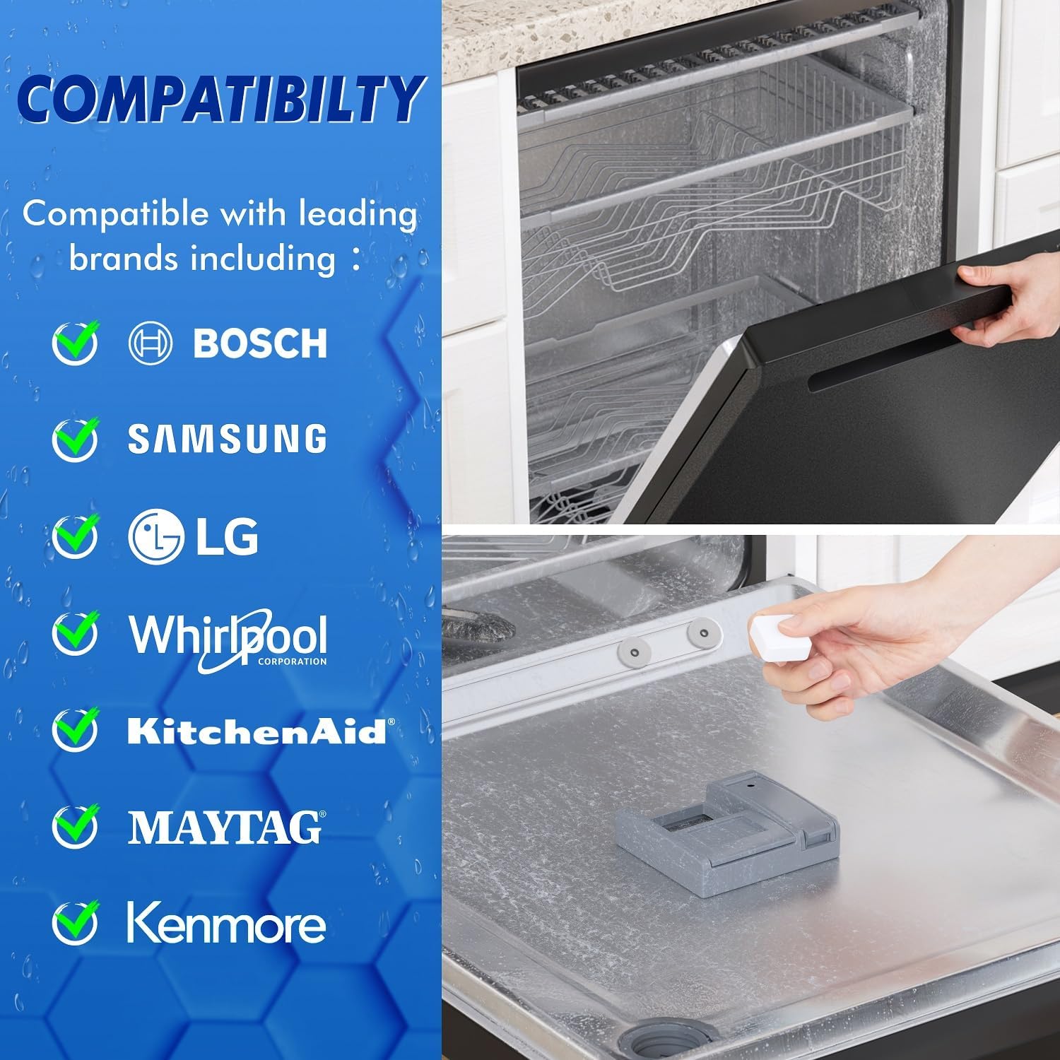 - Septic-safe, plastic/stainless steel friendly dishwasher cleaning tablets. Compatible with leading brands including Bosch, Samsung, LG, Whirlpool, KitchenAid, Maytag, Kenmore and more.
