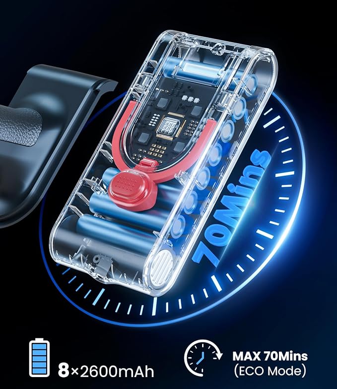 - 【Max 70Mins Running Time】The cordless stick vacuum cleaner features 8*2600mAh rechargeable batteries, breaking through battery life limitations with up to 70 minutes of operation in ECO mode. Clean your entire home in one go—from living rooms to bedrooms, study to kitchen—and say goodbye to frequent recharging.