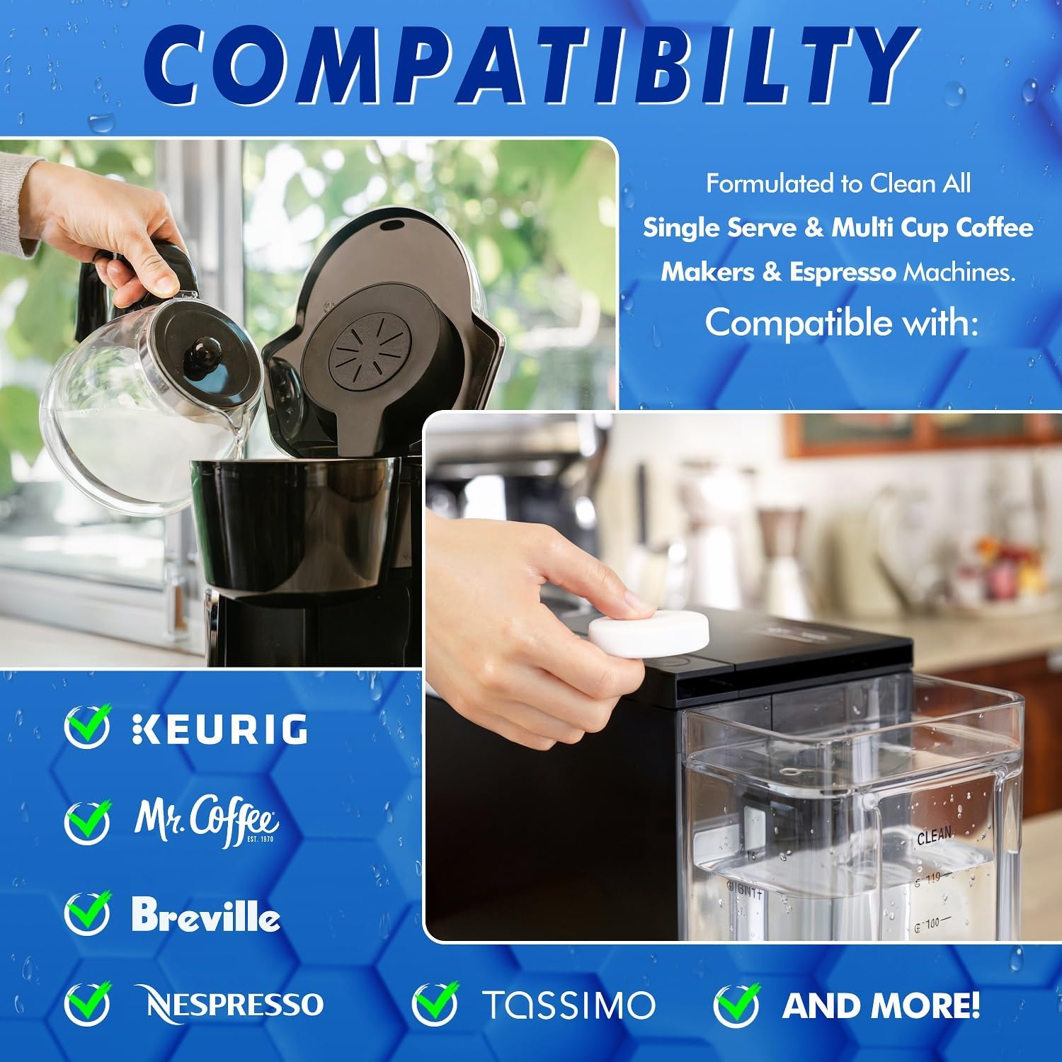 - 3X Cleaning Power: One large tablet delivers the cleaning power of 3 doses of standard liquids, powders, or small tablets. Engineered for slow dissolution, our heavy-duty formula penetrates deep to eliminate tough buildup—limescale, coffee oil residue, hard water deposits, and other mineral buildup—unlocking coffee's full flavor potential.