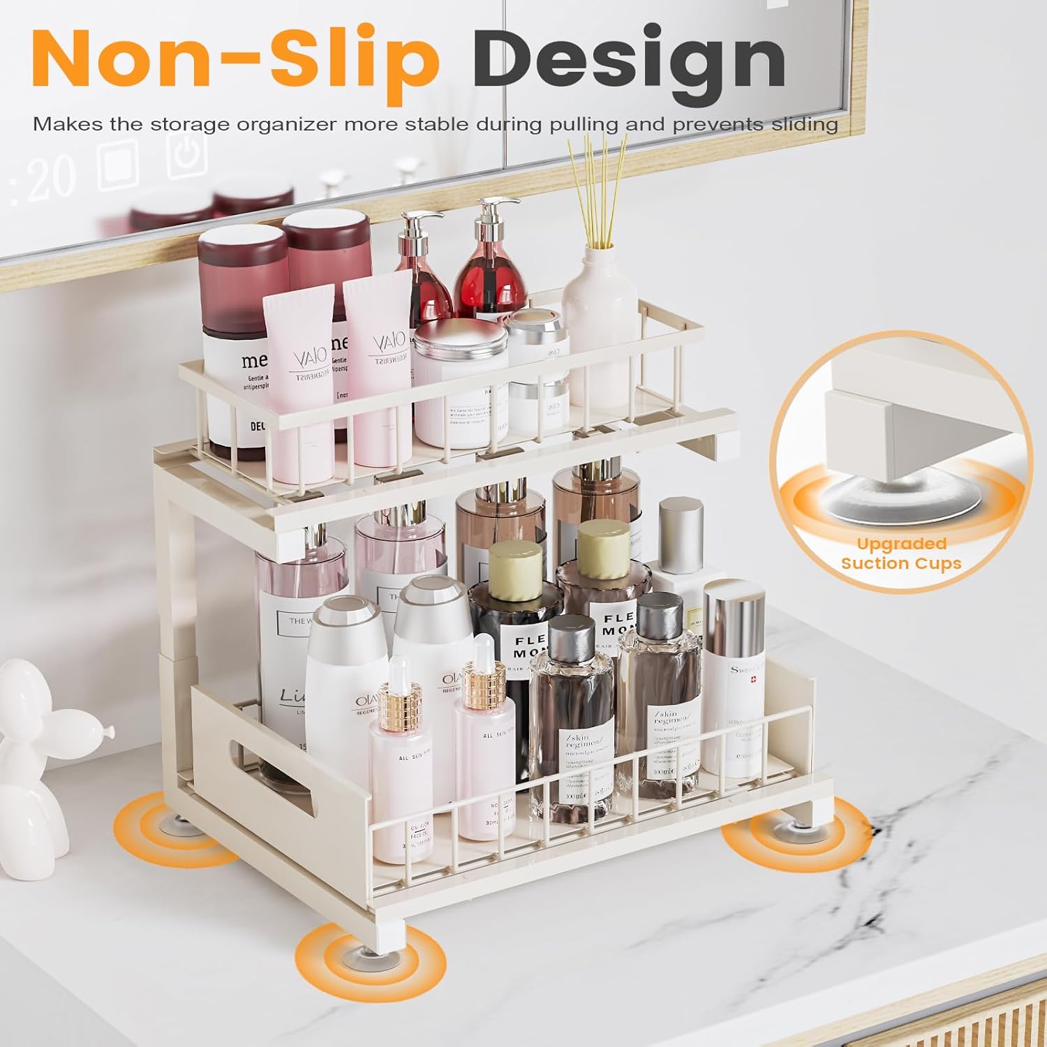- Double Sliding Drawers& Over-pull stopper: Our bathroom organizers and storage allows you to pull out the basket smoothly without effort even when full loaded.This 2-tier slide-out under sink organizer and storage features a blocking device to prevent over-pulling and ensure the basket remains stable. It enables easy access to items you need without any hassle