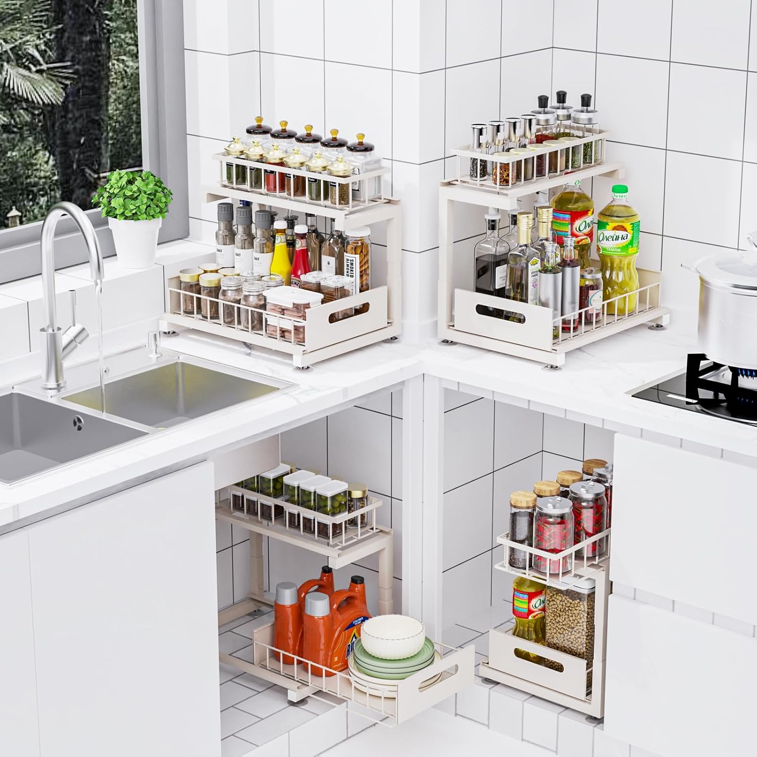 2 Pack Under Sink Organizer, 2-Tier Heavy Duty Metal Pull Out Cabinet Organizer Slide Out Sink Shelf Organizer Height Adjustable, Multi-Purpose Storage Shelf for Kitchen Bathroom (Sand, 2 Pack)