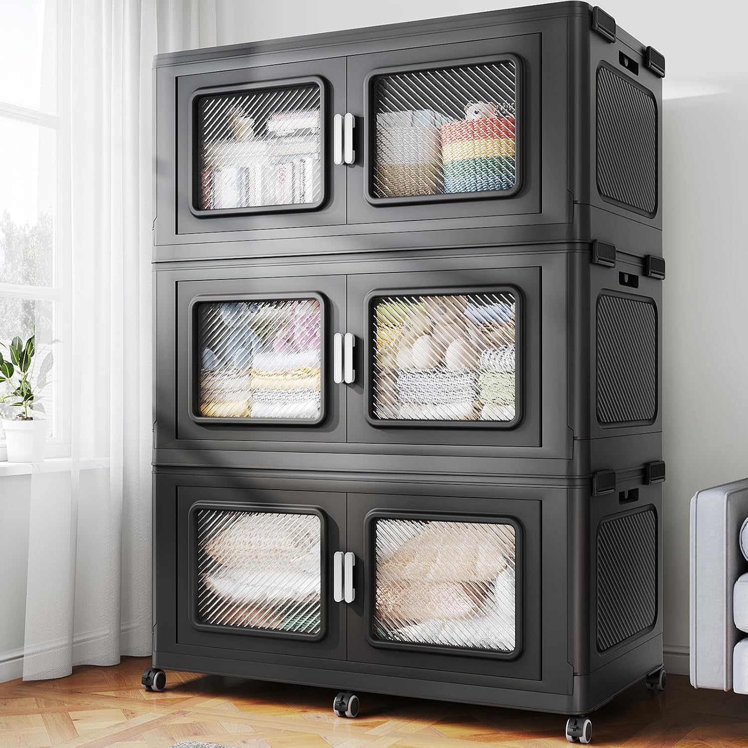 - 【Stackable Design & 360° Rotating Wheels】Our stackable storage bins with wheels design enables secure multi-layer stacking, reinforced by double side 2-buckles and 1 rear buckle for stability. Heavy-duty storage cabinet equipped with 6 TPR-coated 360° swivel wheels for effortless mobility, keeping spaces tidy and organized