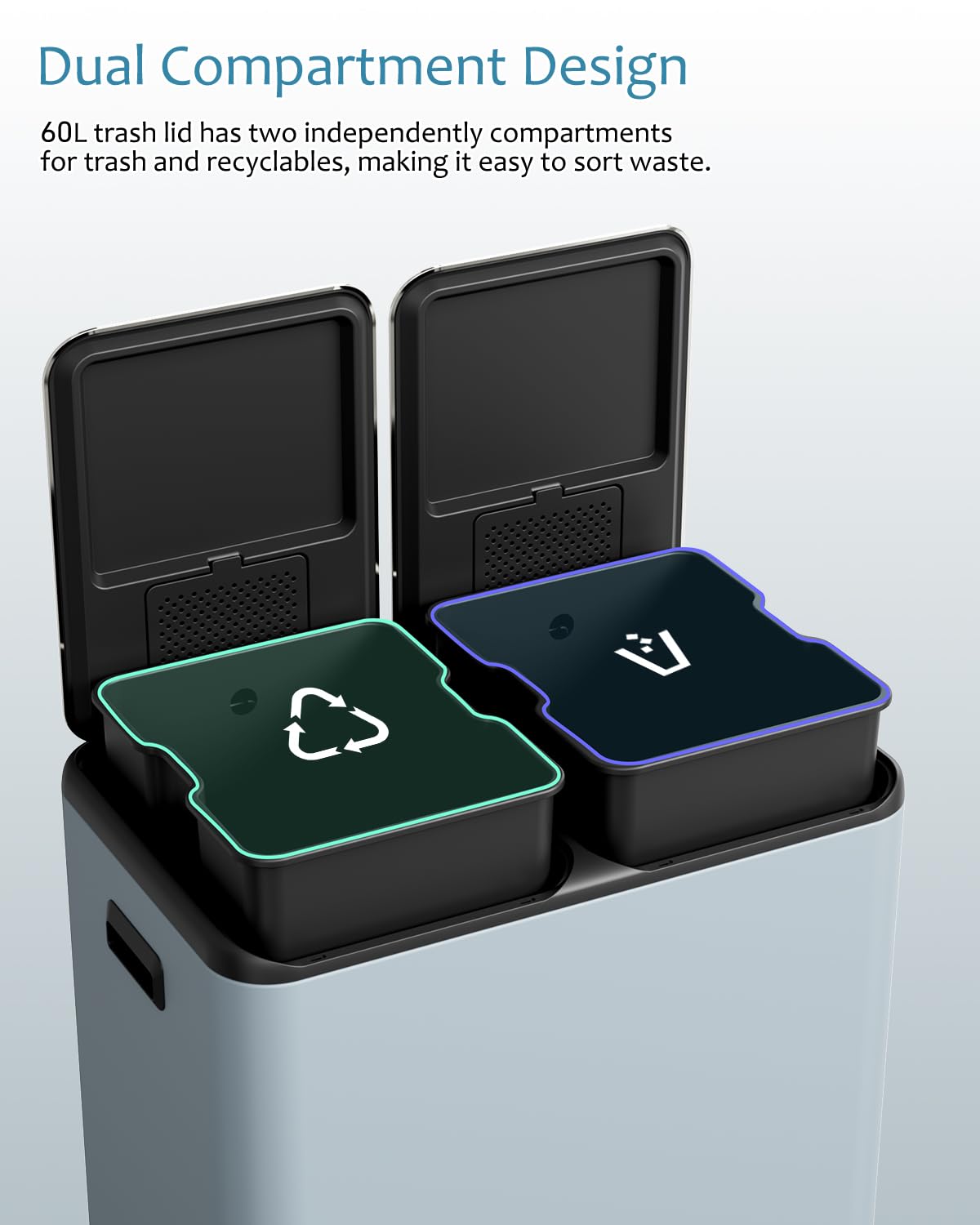 - 2 Removable Inner Buckets: Dual compartment trash can offers separate bins for different types of waste. Each compartment has its lid, which allows you to sort waste efficiently. With a generous capacity of 2 x 8 gallons, combo garbage bin meets your daily needs