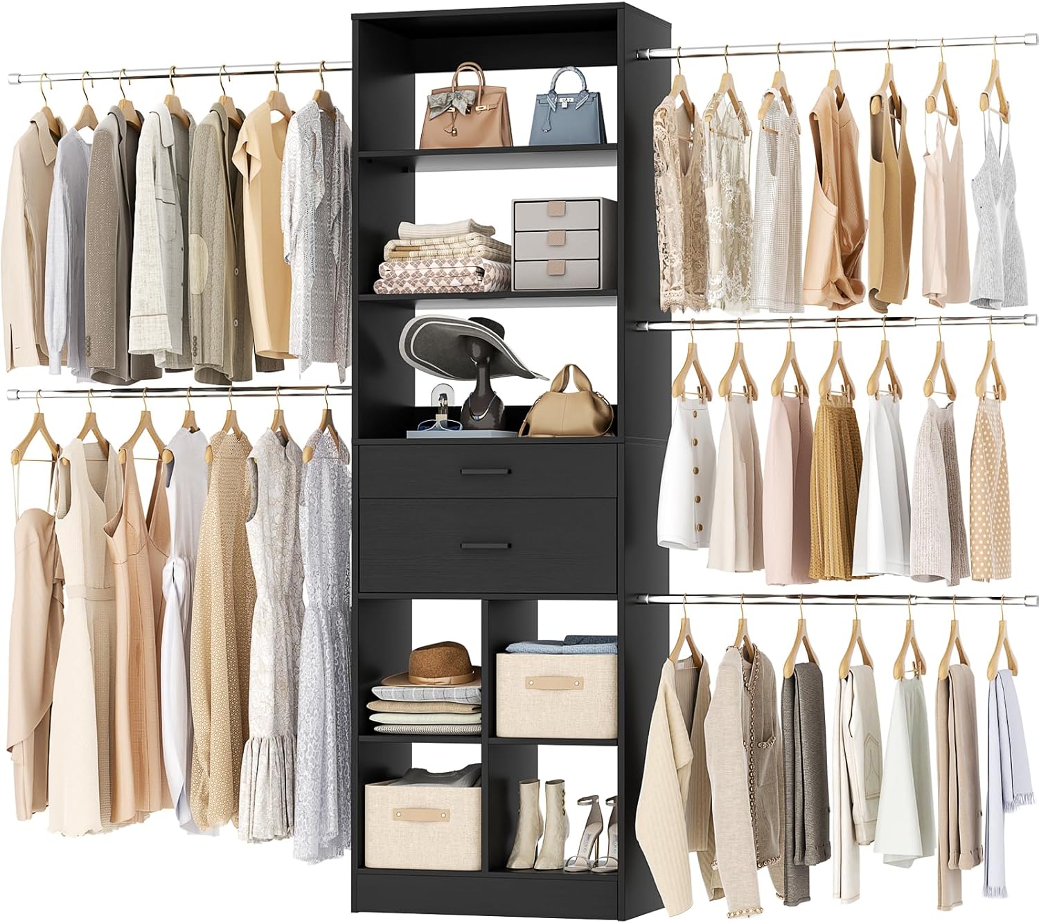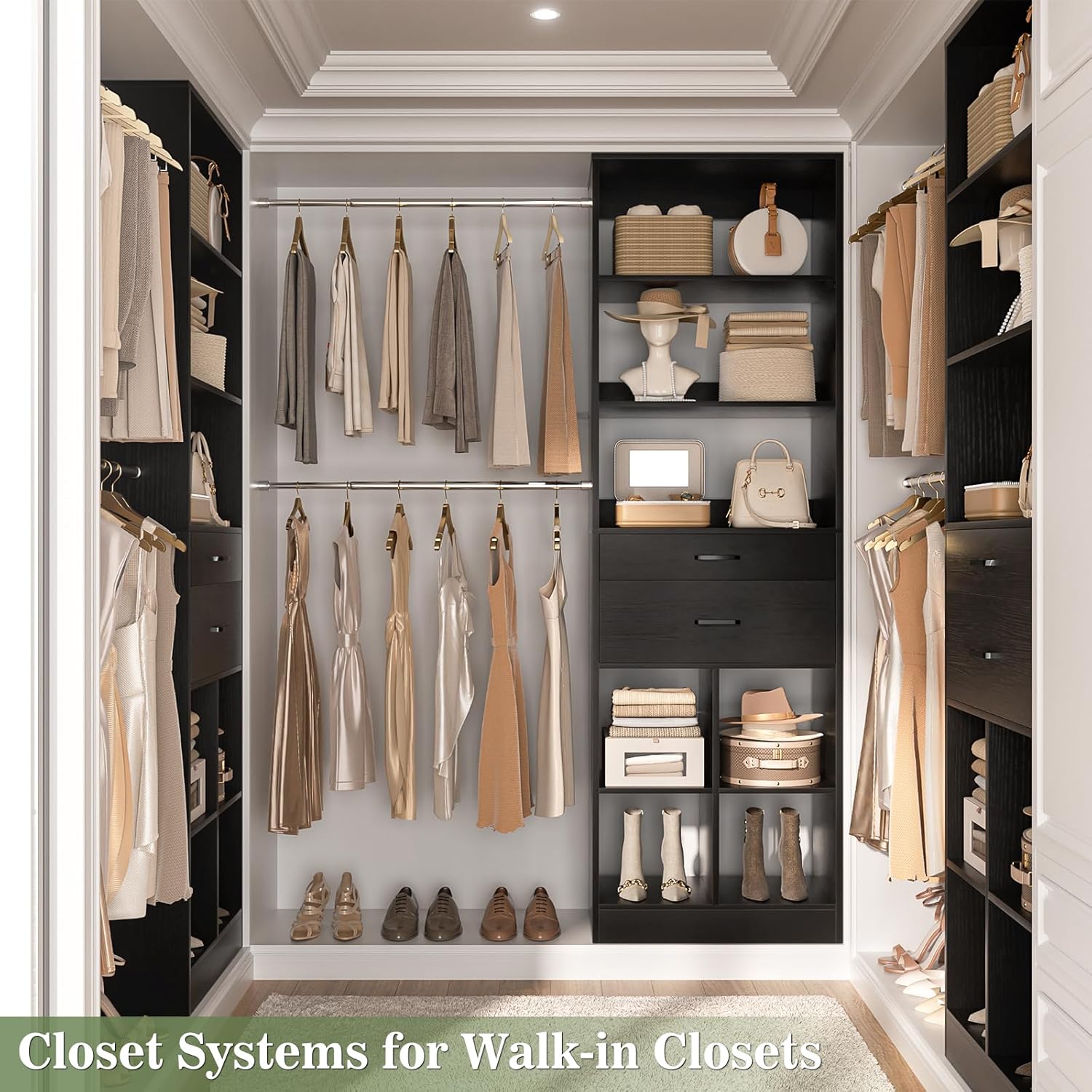Closet System, 4-8 FT Closet Organizer Tower with 2 Wooden Drawers and Shelves, Can Fit 60 to 96 inch Walk-in Closet System with 5 Hang Rods, Built-in, Black