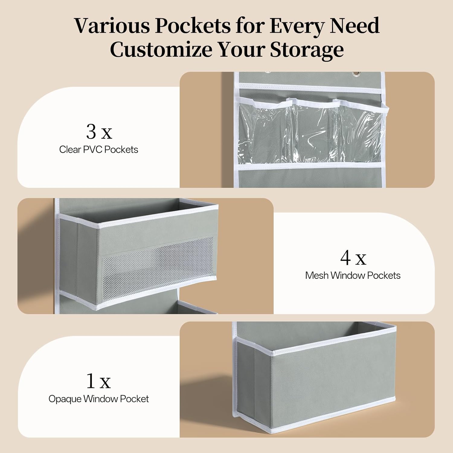 - 5*14*61in Large Capacity: This over the door organizer nursery features 8 distinct pockets – 3 transparent PVC, 4 mesh window, and 1 opaque window .It allows for precise categorized storage of baby supplies, wipes, snacks, gloves, scarves, toiletries, clothes, and more, keeping items neat and easily accessible, with a capacity far exceeding that of ordinary organizers.