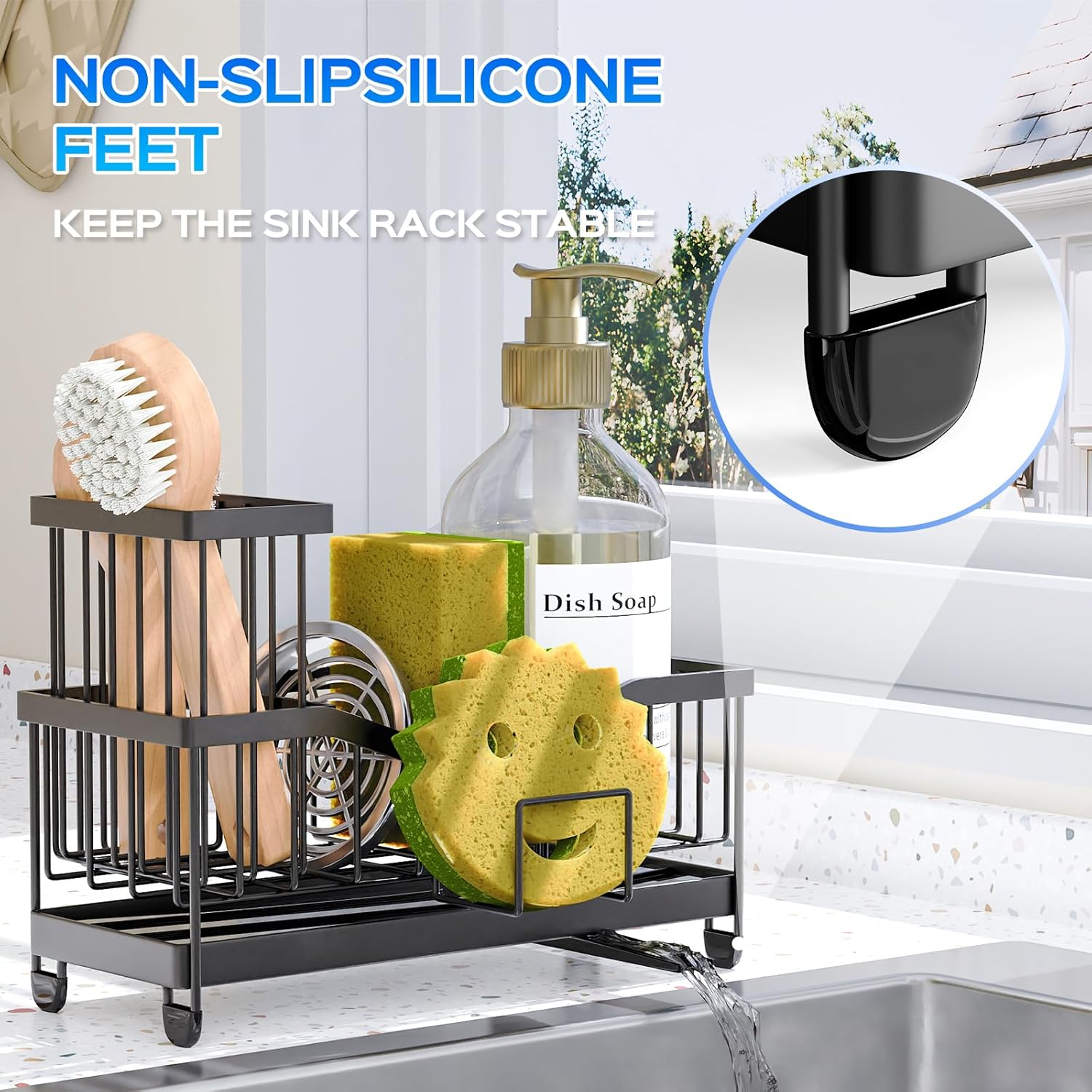 - 『Sturdy & Anti-Slip Design』Four anti-slip pads are installed at the bottom of the sponge rack to ensure that the water storage rack is securely fixed to the kitchen sink countertop, preventing it from falling or moving due to unstable center of gravity, and protecting the kitchen countertop from scratches. Please ensure that you feel comfortable and safe when using the water storage utensils.