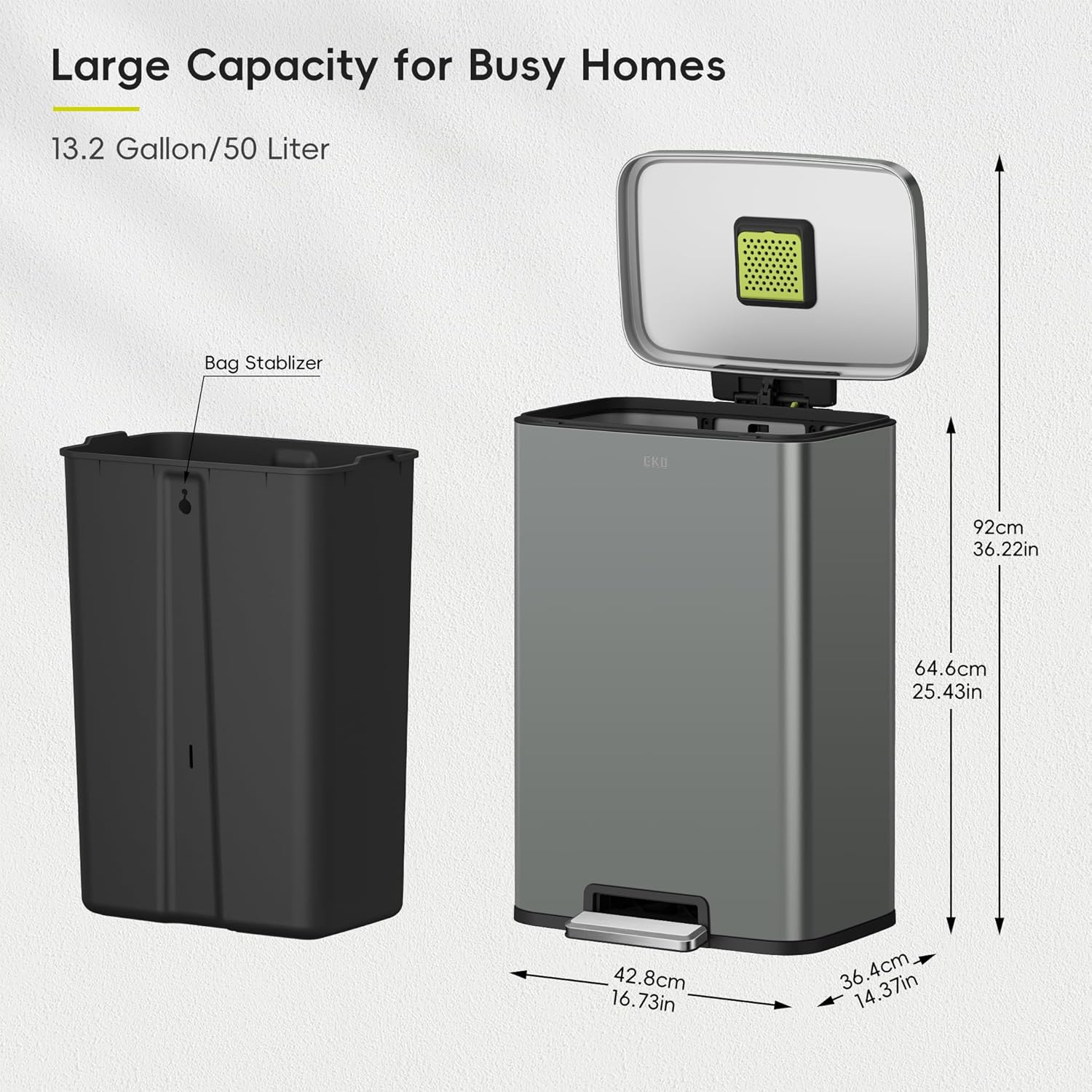 EKO Madison Nardo Grey Stainless Steel 50 Liter/13.2 Gallon Step Trash Can with Inner Liner - Fingerprint Resistant Finish