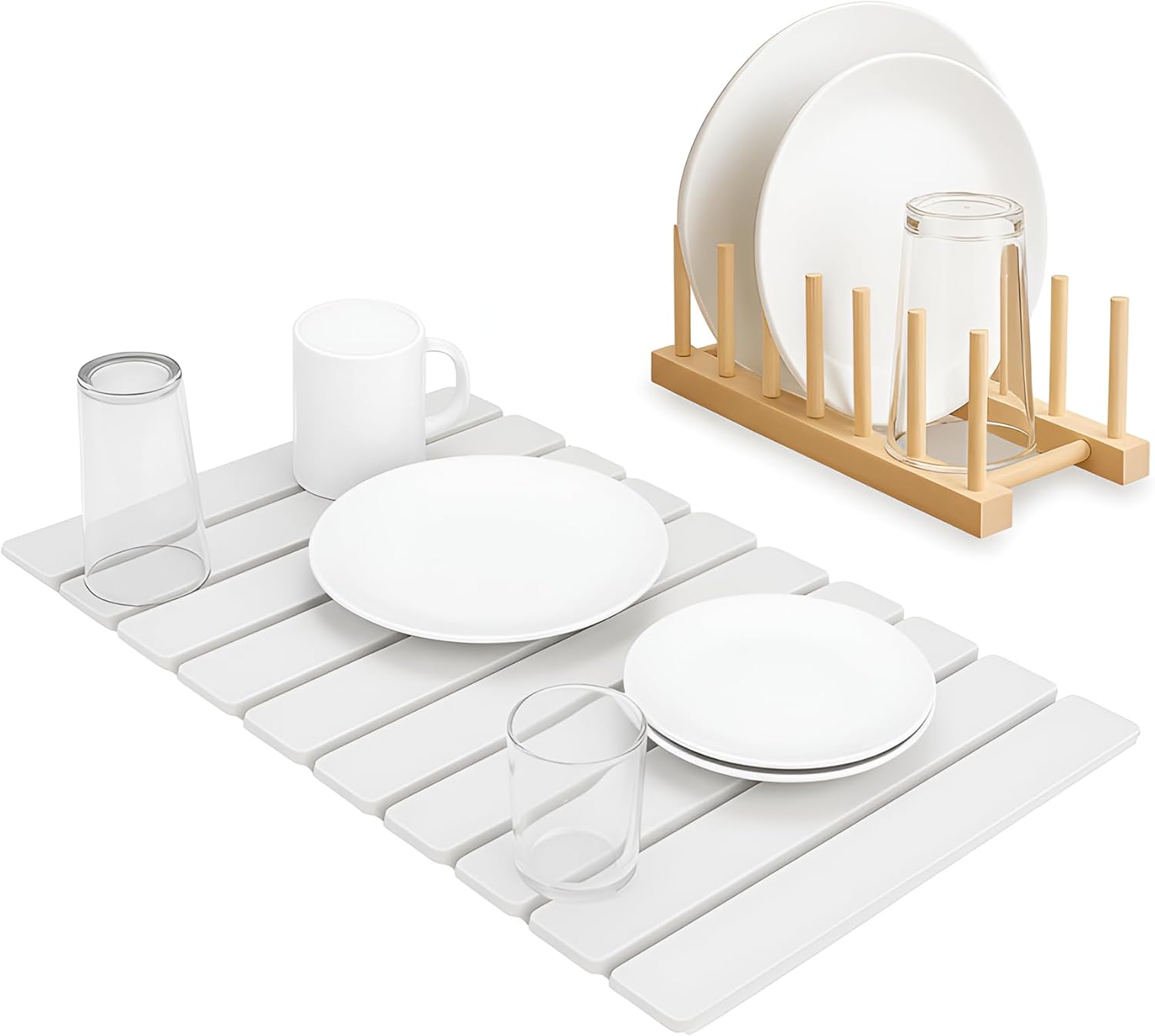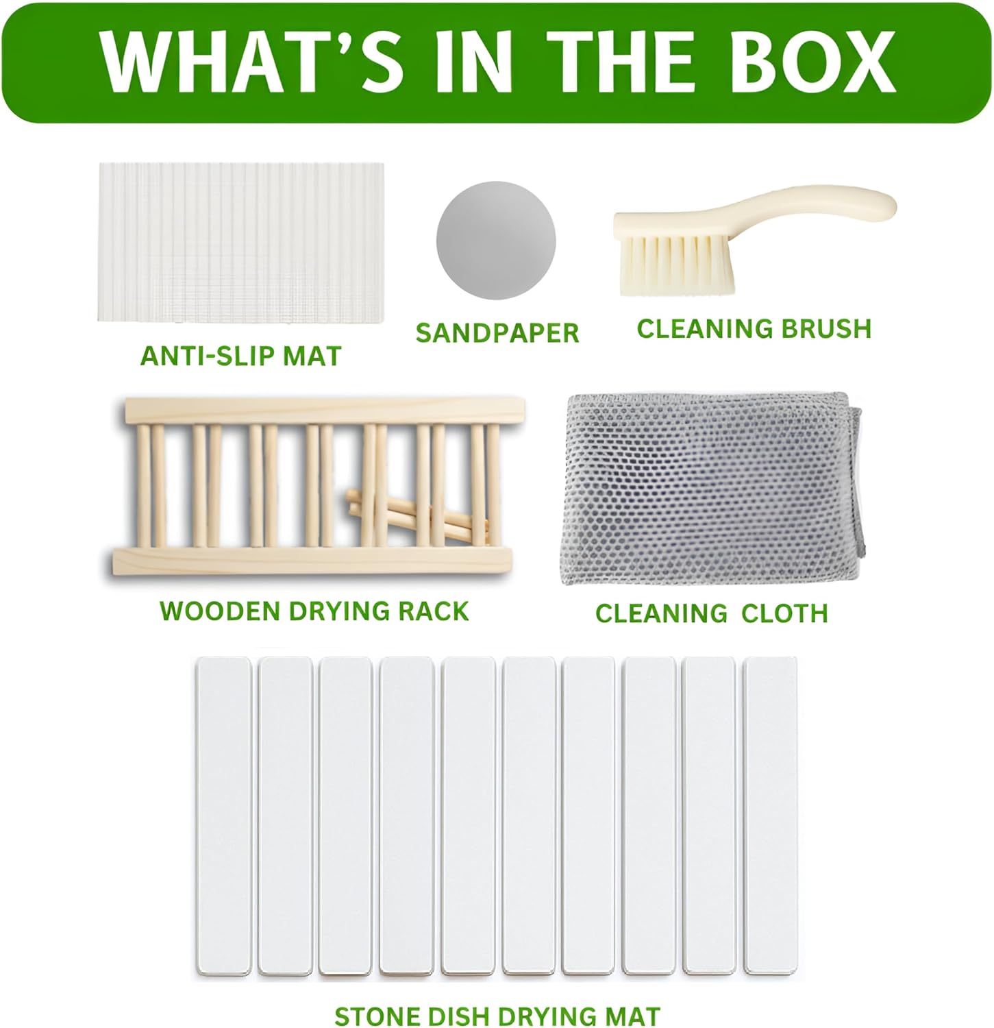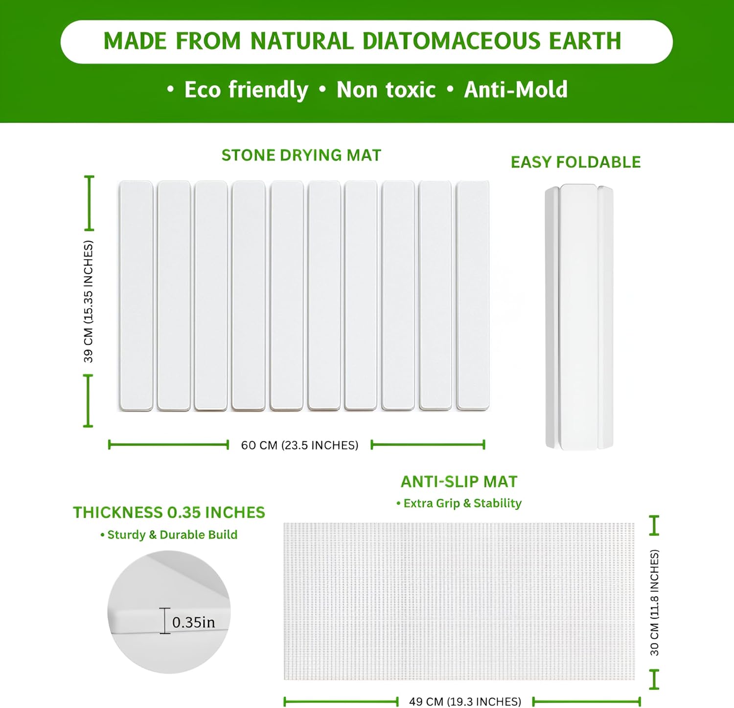 - Super Absorbent & Quick Drying – Hygienic Countertops Crafted from natural diatomaceous earth, this stone drying mat instantly absorbs water and dries in minutes. Curved grooves improve airflow, prevent pooling, and keep counters fresh, odor-free, and hygienic.