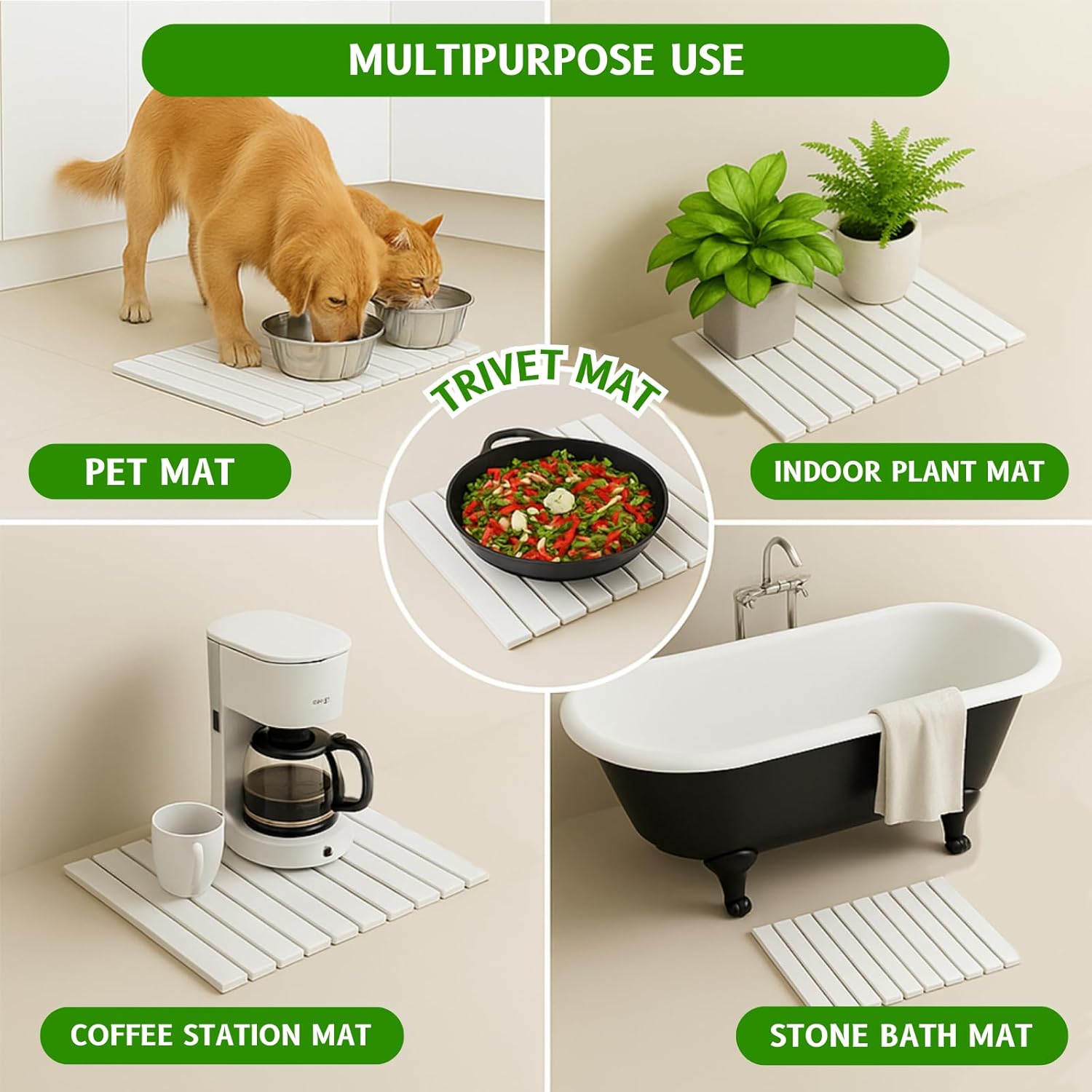 - Large 24" × 16" Multipurpose Mat – Foldable & Space-Saving Generously sized to hold dishes, pans, and utensils, yet foldable and compact for easy storage. Beyond the kitchen, use it as a bath mat, heat-resistant trivet, plant saucer, or pet feeding mat.