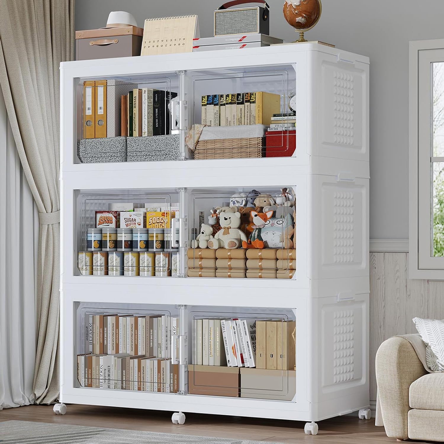- 【Two Ways to Open & Clear Magnetic Door】The collapsible storage bins with lids and wheels feature a dual access way, allowing for both top and front door openings, and with clear windows for easy visibility. The stackable plastic storage bins with open front doors are equipped with magnetic lock buckles to prevent dust from entering the cabinet.