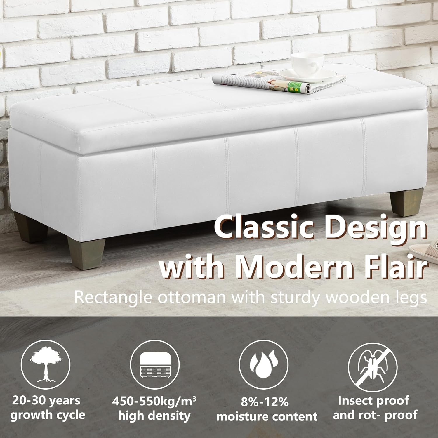51 Inch Faux Leather Ottoman with Storage, End of Bed Bench with Large Storage, Rectangular Extra Long Bench for Bedroom and Living Room, White