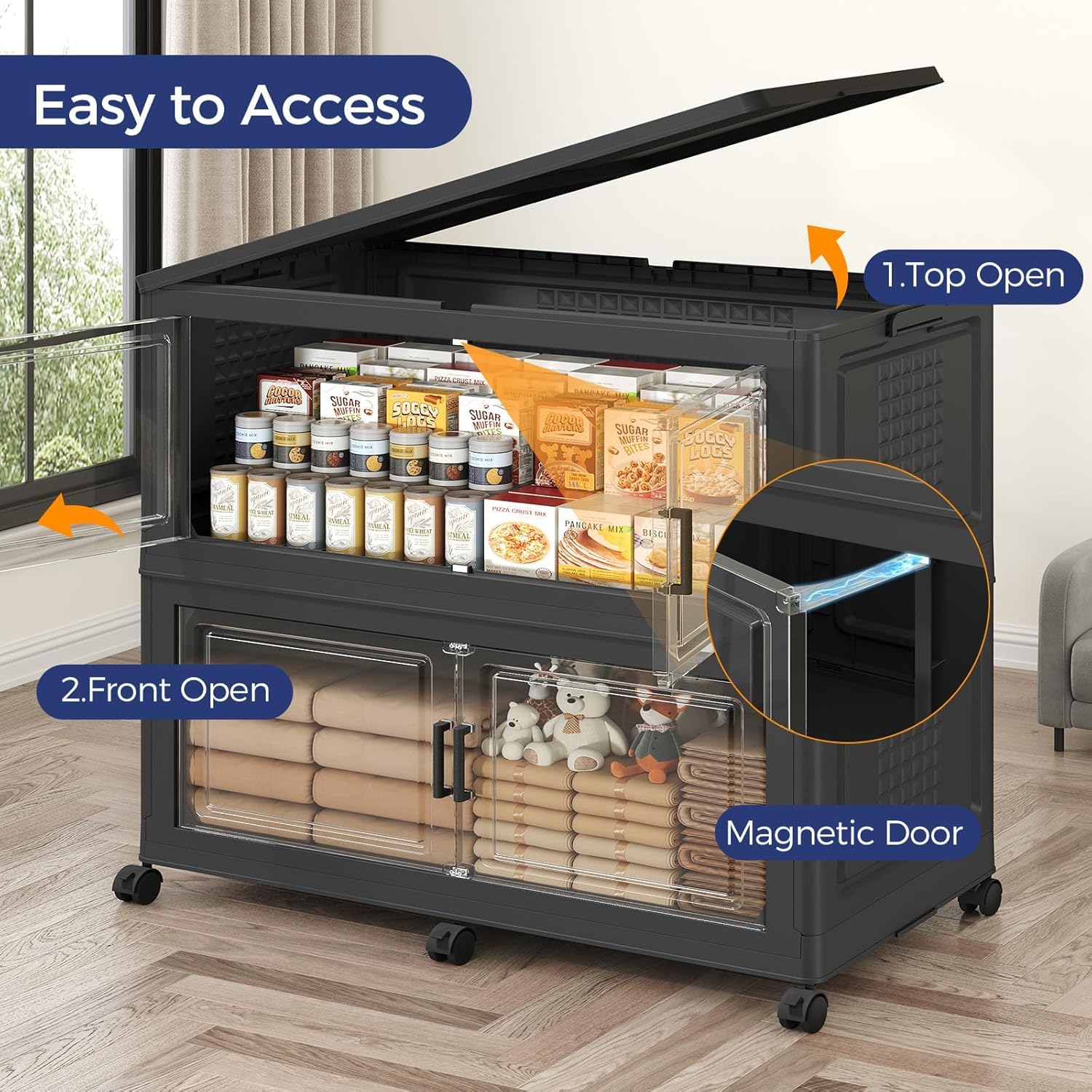 - 【Two Ways to Open & Clear Magnetic Door】The collapsible storage bins with lids and wheels feature a dual access way, allowing for both top and front door openings, and with clear windows for easy visibility. The stackable plastic storage bins with open front doors are equipped with magnetic lock buckles to prevent dust from entering the cabinet.