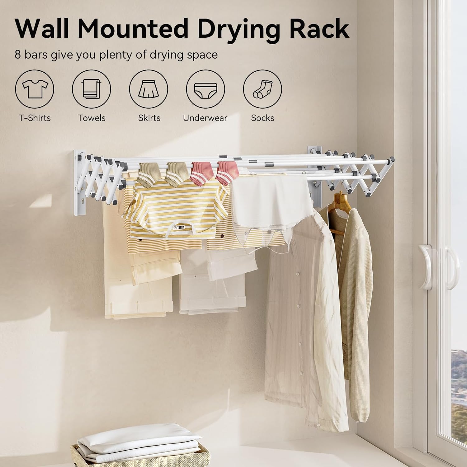 - Great for Small Space - The retractable clothes drying rack folds flat against the wall in less than 4.75" thick, making it perfect for small spaces like bathrooms, balconies, and laundry rooms without sacrificing drying capacity.