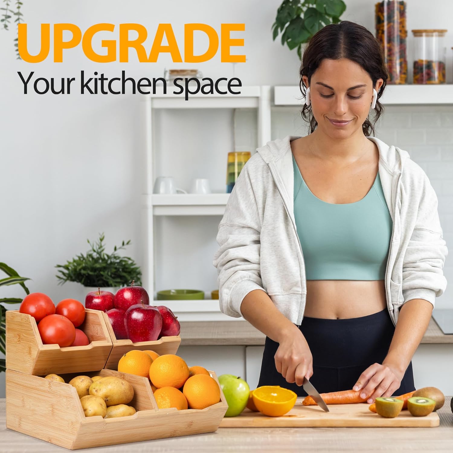 Pantry Storage Bins 3-Pack, Stackable Bamboo Containers for Potato & Onion Storage, Kitchen Organization & Decor