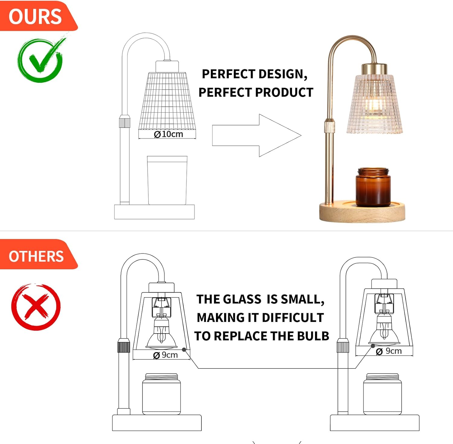 - Timer,Dimmer and Height Adjustment : Vintage modern electric candle warmer lamp uses a 50W GU10 halogen bulb and a dimmer switch to provide the perfect ambiance.Bedroom candle warmer lamp home decor with four levels of dimming,you can control the melting speed of the candle,the brighter the setting,the faster it melts.The wax melt lamp also features a 2/4/8-hour timer function for added safety,ensuring your candles don't burn continuously.Two 50W light bulbs are in the package (candle not included).Living room candle lamp with an easy turn of the button, the height can be adjusted up to 12.2 inches