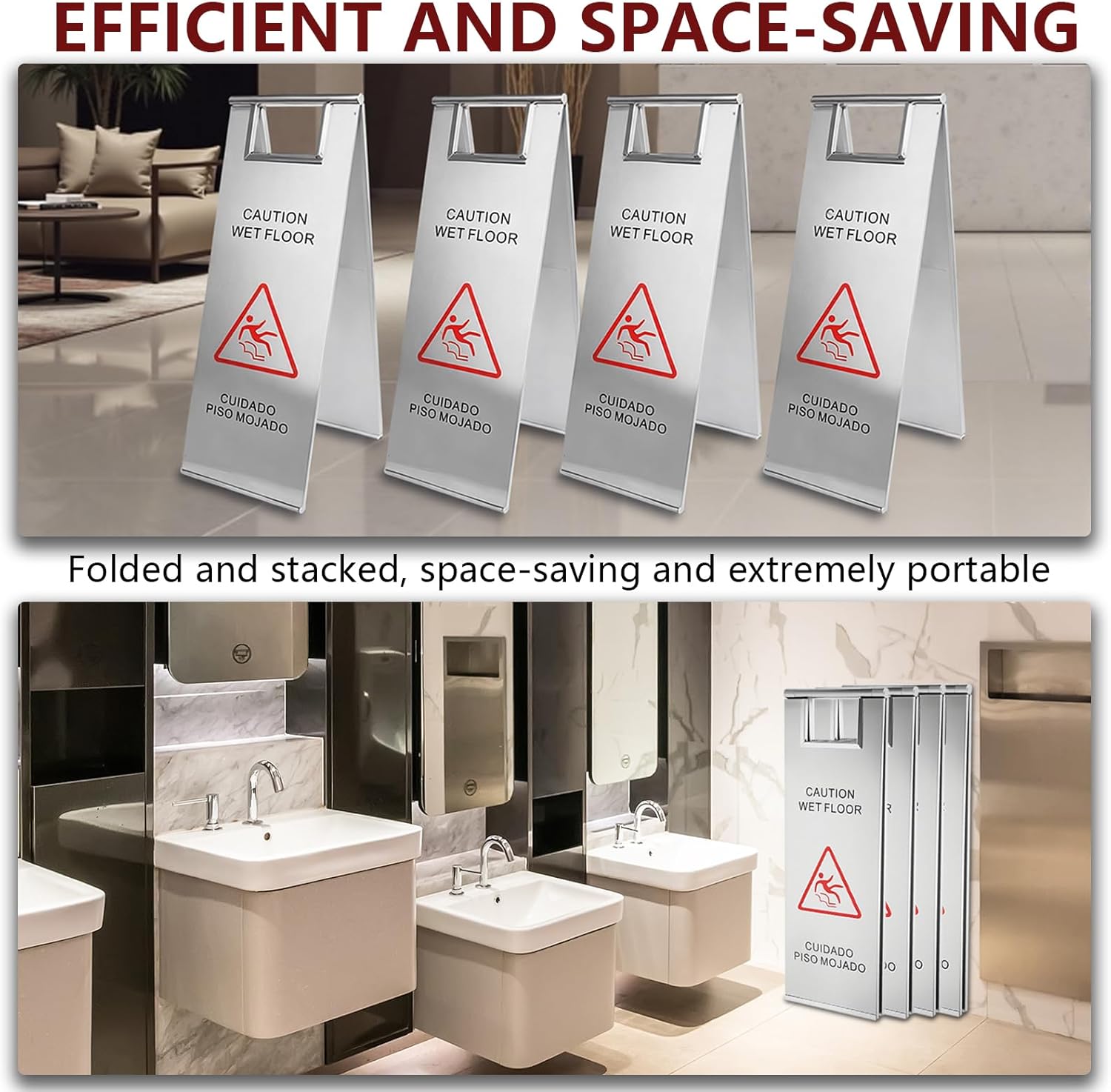 - Complete Set of Durable Wet Floor Signs – Includes 4 heavy-duty stainless steel caution signs, each measuring 24 x 8.6 inches (12.5 inches wide when open) and weighing 8.5 lbs for enhanced stability. Features bold red printing for maximum visibility.