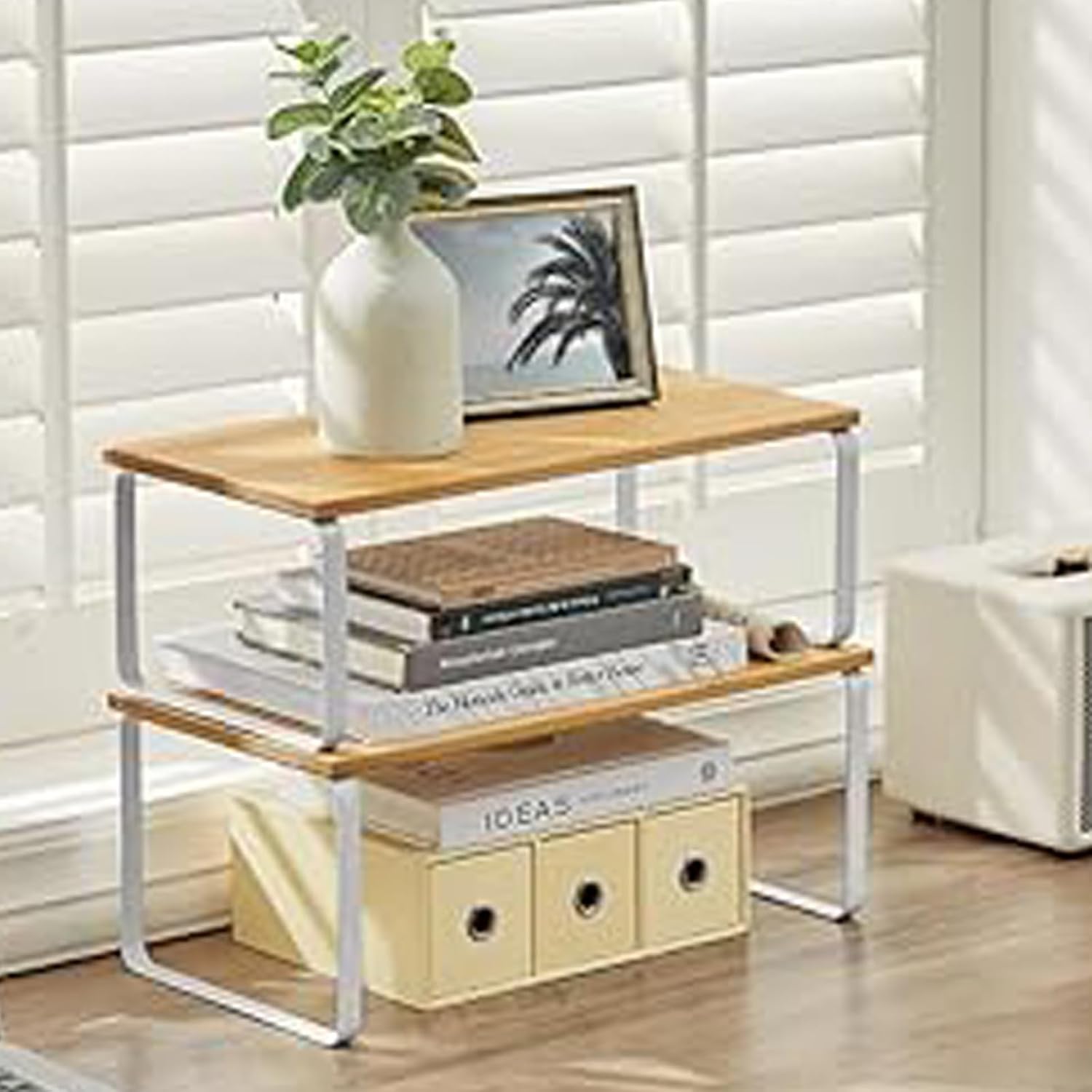 Cabinet Organizer Shelf, Kitchen Counter Storage, 2-Piece Set, Stackable Spice Rack, Metal and Wood (White and Natural Beige)