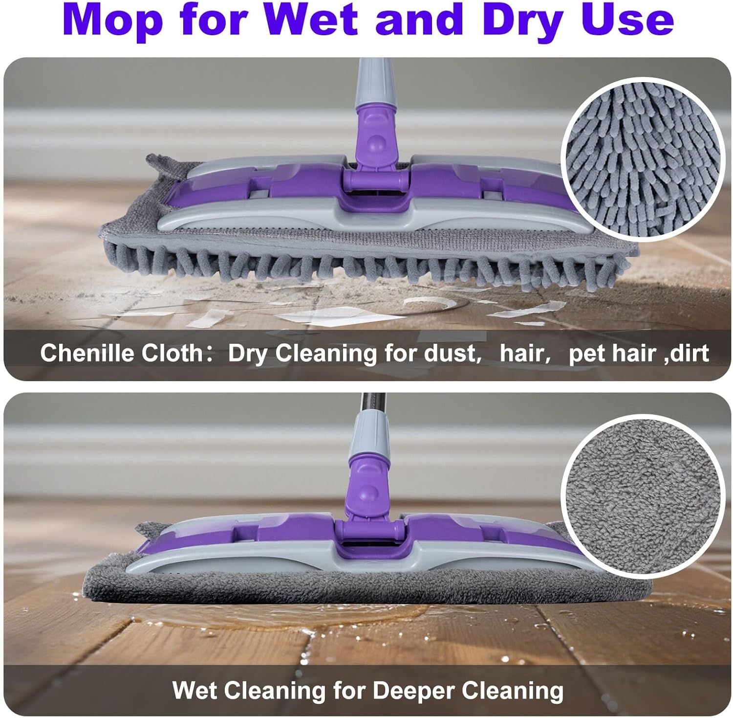 - 【Chenille Pads and Microfiber Pads】Our floor mop system is equipped with three microfiber pads with the size of 37*23.5cm/14.57*9.2 inch and one chenille cloth with the size of 36*21.5cm/14.17*8.46inch, so you can switch between them freely. Compared with other mops, our microfiber mop pad has strong water absorption can deeply clean stubborn stains, and the chenille surface can effectively absorb fine dust and hair, which is very suitable for dry and wet cleaning. It can be washed by hand after use and can be reused