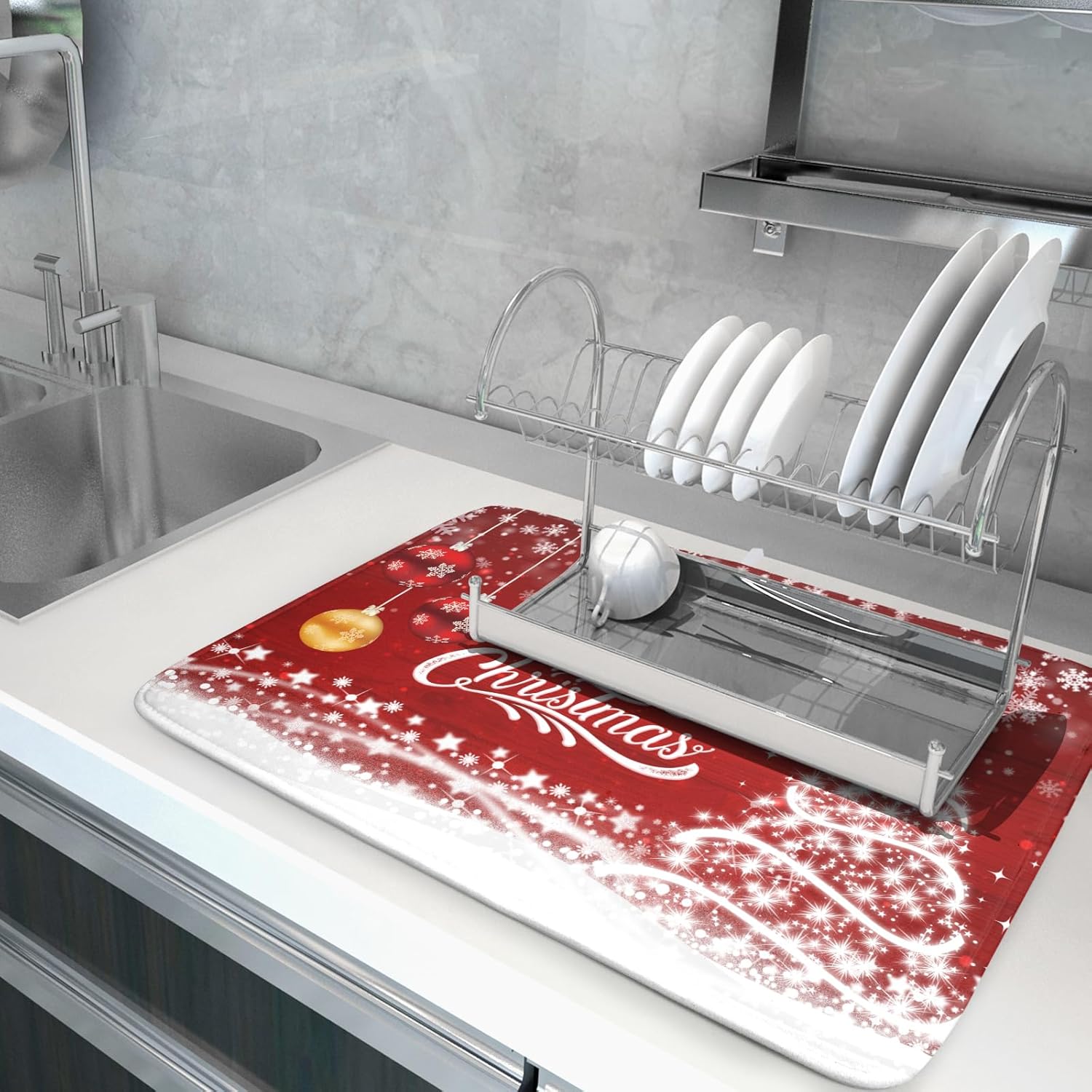 Merry Christmas Dish Drying Mat for Kitchen Counter Winter Snowflake Pine Fast Absorbent Red Drying Mat 18x24 Inch Xmas Jingle Bells Decoration Dishes Pad Dish Drainer Rack Mats Holiday Decor