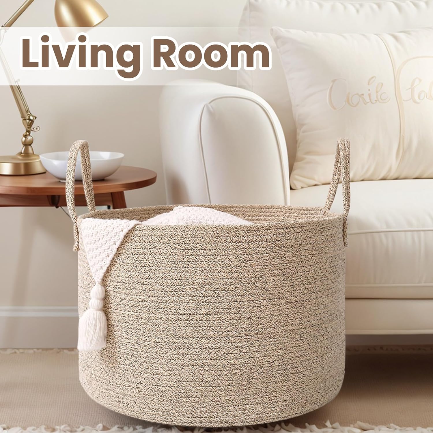 Woven Blanket Basket,65L Large Rope Storage Bin with Handles, Organizer for Blankets Toys Book and Clothes, Laundry Basket for Living Room Bedroom Nursery,Oatmeal