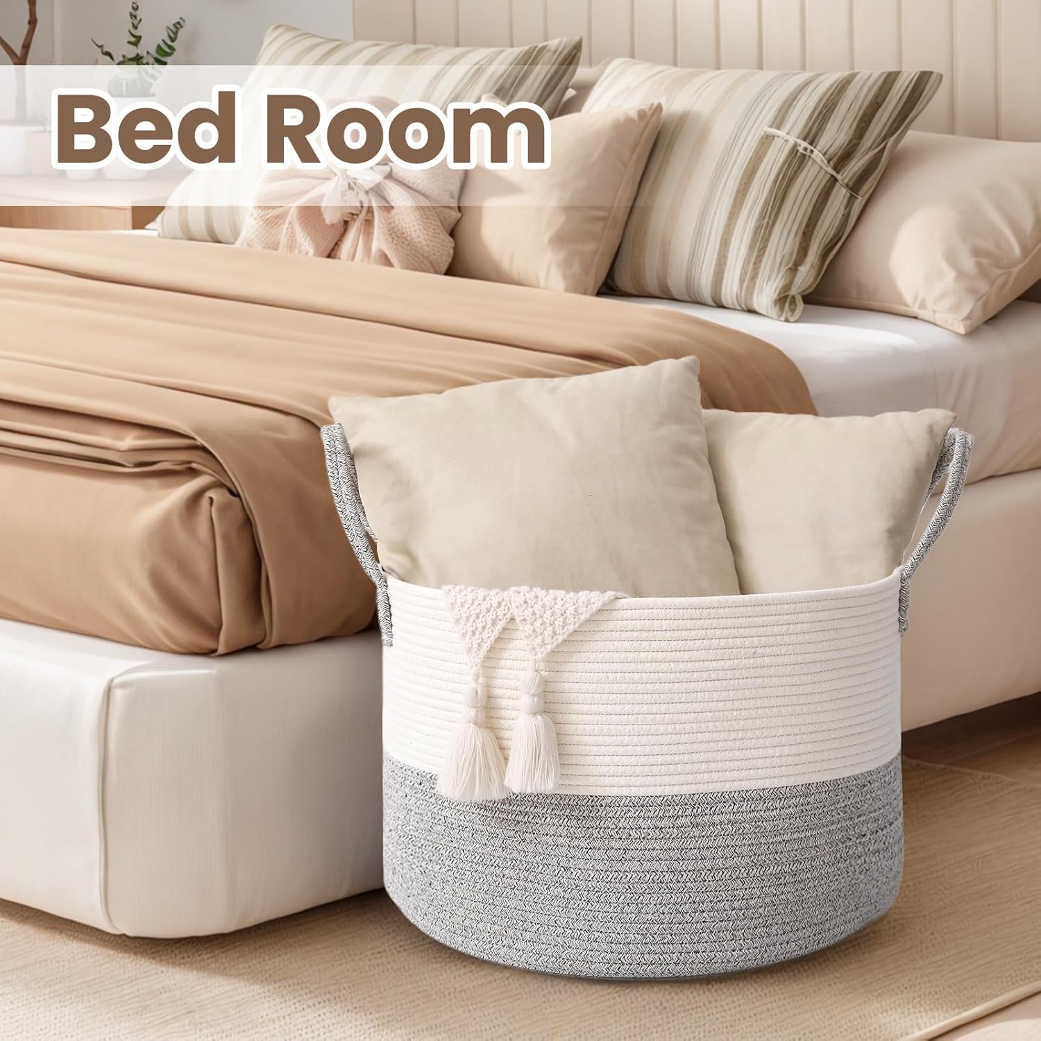 Woven Blanket Basket,65L Large Rope Storage Bin with Handles, Organizer for Blankets Toys Book and Clothes, Laundry Basket for Living Room Bedroom Nursery,White&Grey
