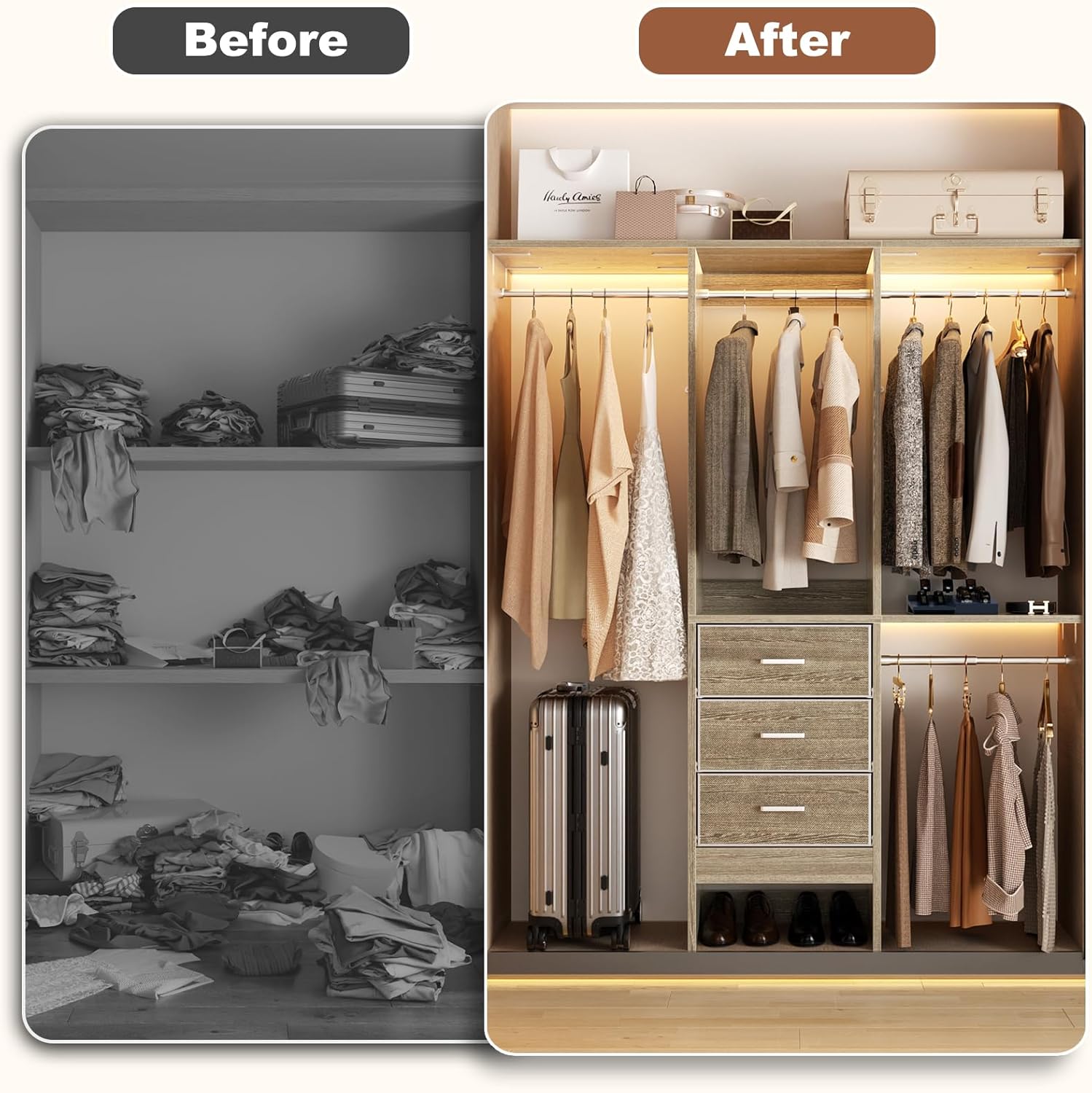 - About Organization and Capacity - This 48 closet has 3 adjustable sturdy storage shelves, so you can hang the cloth on the hanging rods and you can also put clothes on the shelves too. It is a 400+ LBS and 150pcs clothes capacity closet organizer system.