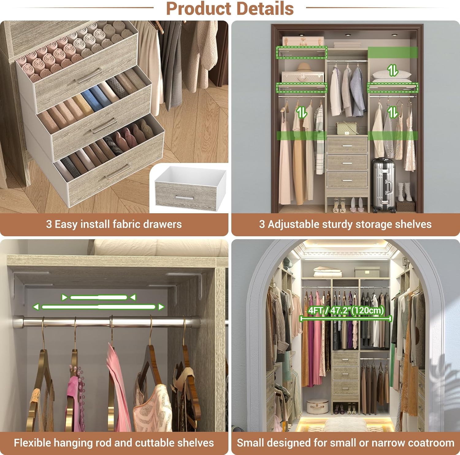 4FT Small Closet System with 3 Fabric Drawers, 48'' Closet Organizer System With 3 Adjustable Shelves, Flexible Built-In Clothes Garment Rack for Small Space, 48"L x 13"W x 71"H, White Oak