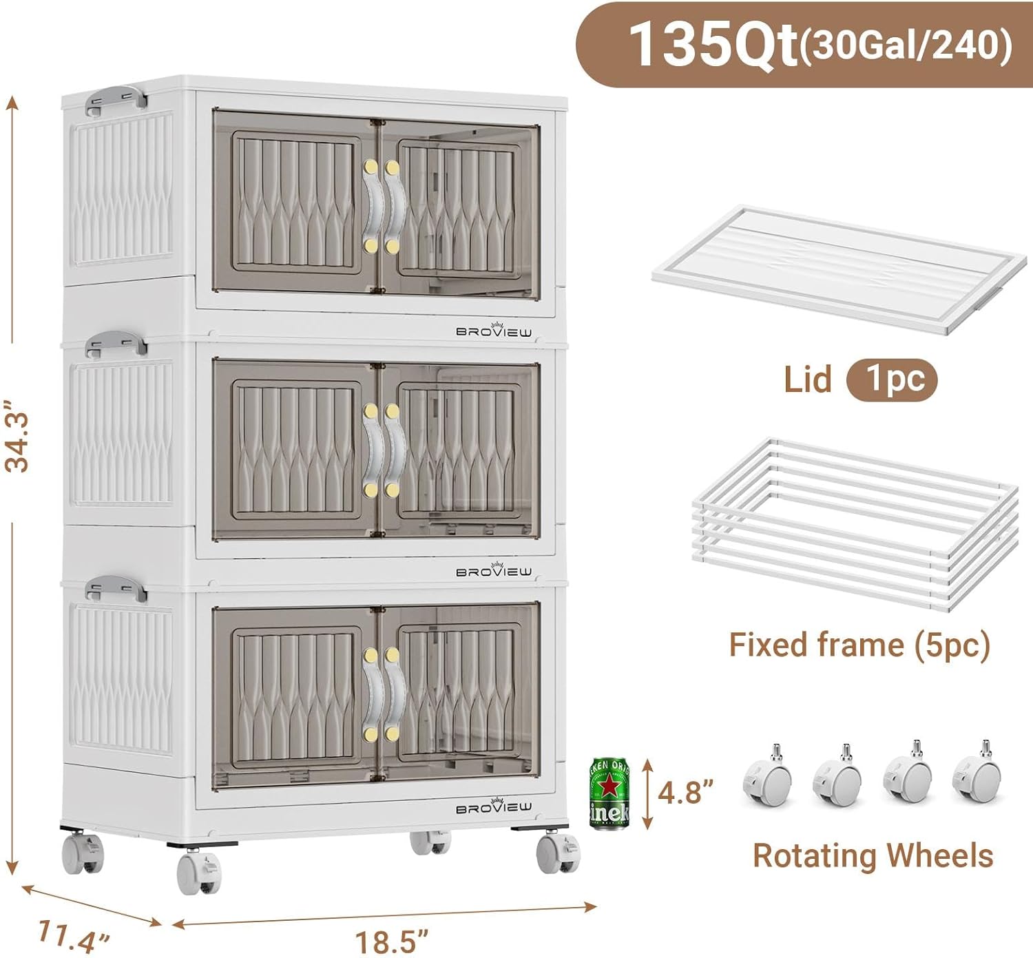 BROVIEW 135Qt Stackable Storage Bins with Lid, Extra Large Closet Organizer Collapsible Drawer Boxes with Wheels, Folding Plastic Cabinet Containers for Home Kitchen Room Organization, 3Pack White