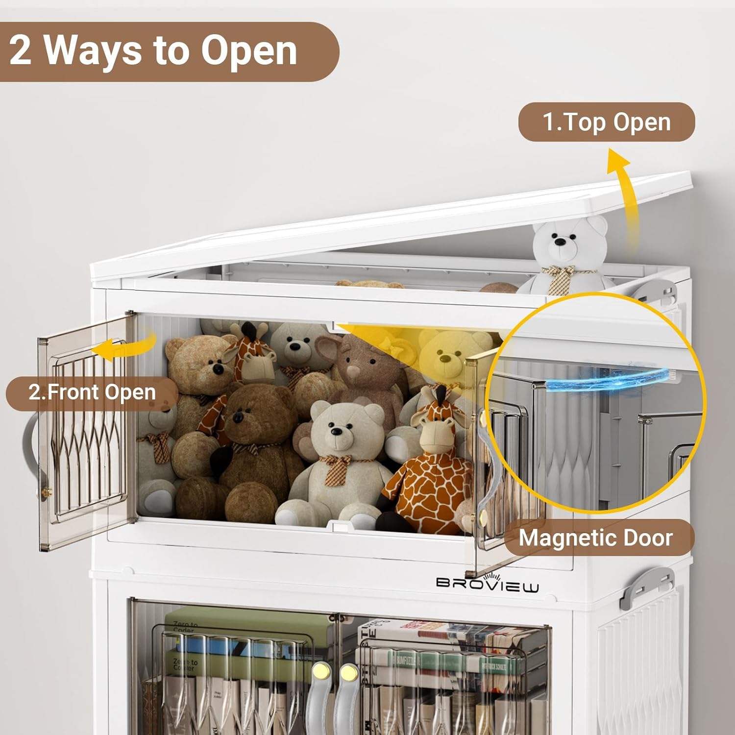 - 【Magnetic Front Open Doors & 4x Wheeled】The large storage bins with doors provide two options: front doors opening or top lid opening. The brown door can be easily seen through and with a magnetic device. The 4x 360-degree rotating wheels all have fixed functions and can be easily moved by releasing the valve, making them friendly to the elderly.