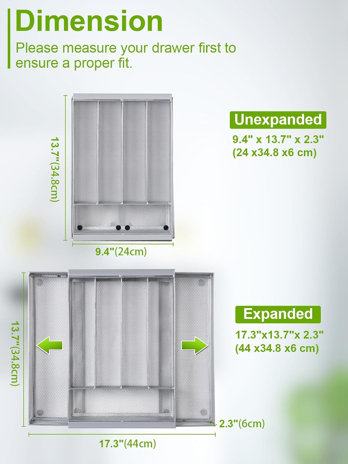 - Anti-Slip & Durable:Equipped with Non-slip Feet to Keep it in Place When Opening or Closing Drawers. The Mesh Panels fit Perfectly, Ensuring Utensils Stay Organized Without Getting Caught. The All-metal Frame Cutlery Organizer Adds Modern Style, Offers Excellent Load-Bearing Capacity, and Maintains Its Shape Under Pressure.