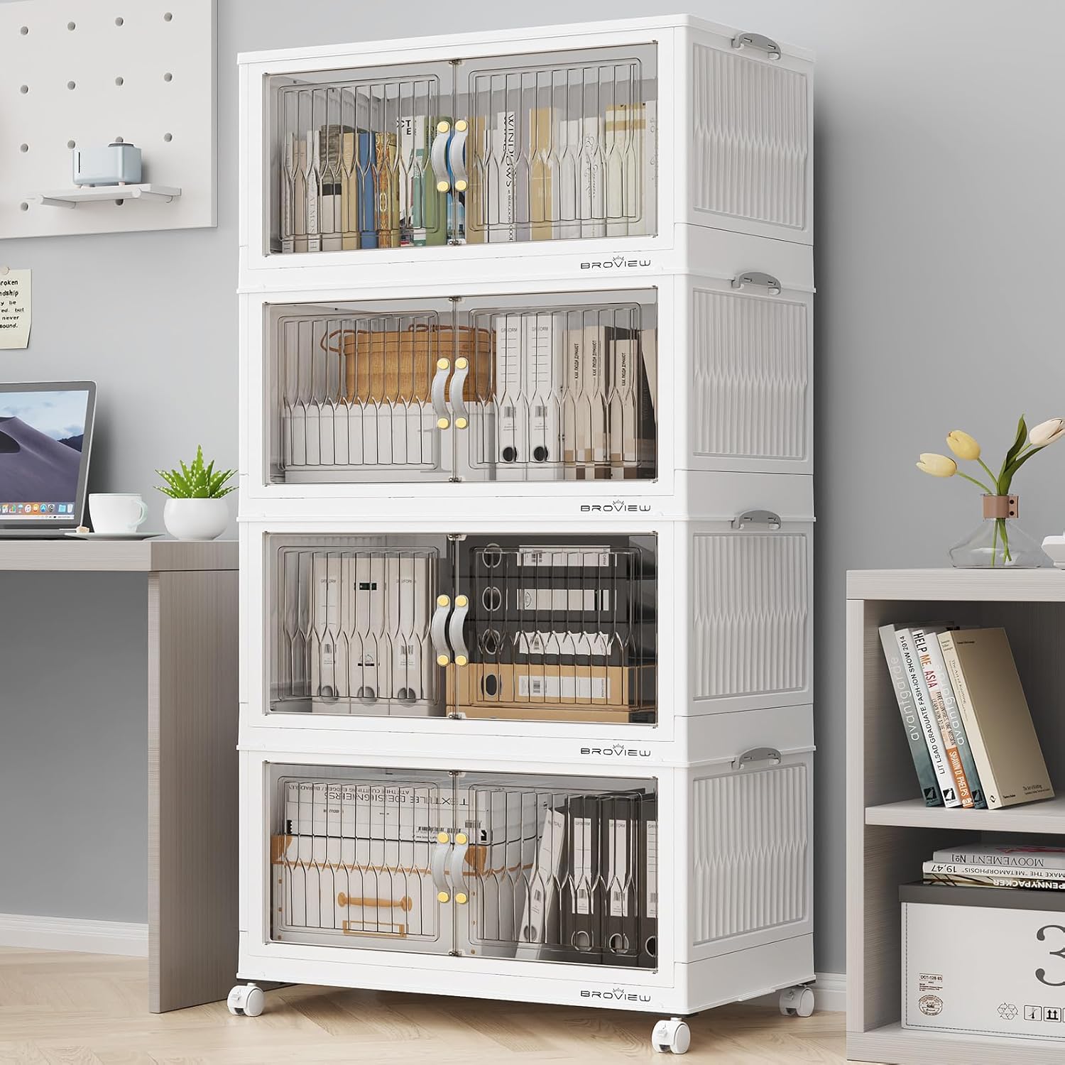 BROVIEW 240Qt Stackable Storage Bins with Lid, Extra Large Closet Organizer Collapsible Drawer Boxes with Wheels, Folding Plastic Cabinet Containers for Home Kitchen Room Organization, 4Pack White