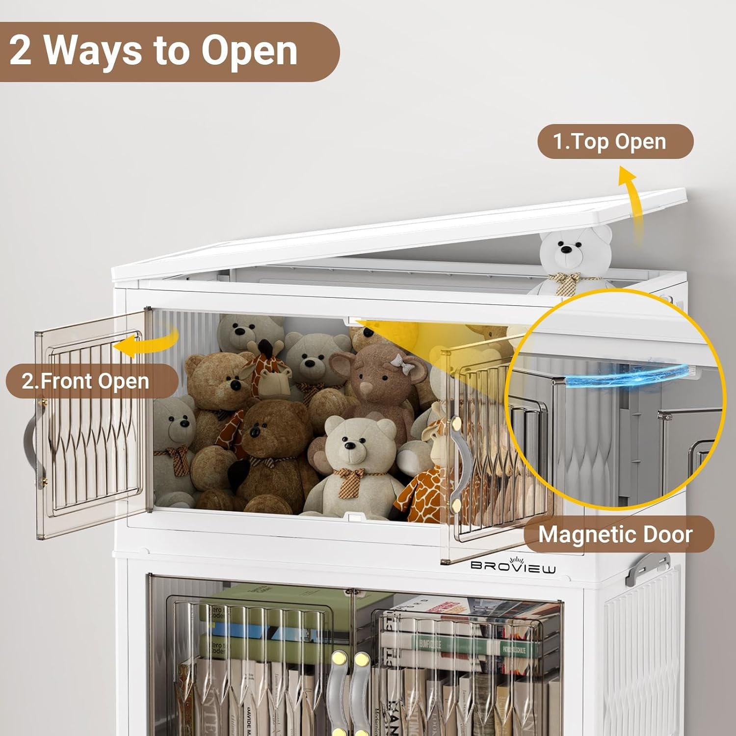- 【Magnetic Front Open Doors & 4x Wheeled】The large storage bins with doors provide two options: front doors opening or top lid opening. The brown door can be easily seen through and with a magnetic device. The 4x 360-degree rotating wheels all have fixed functions and can be easily moved by releasing the valve, making them friendly to the elderly.
