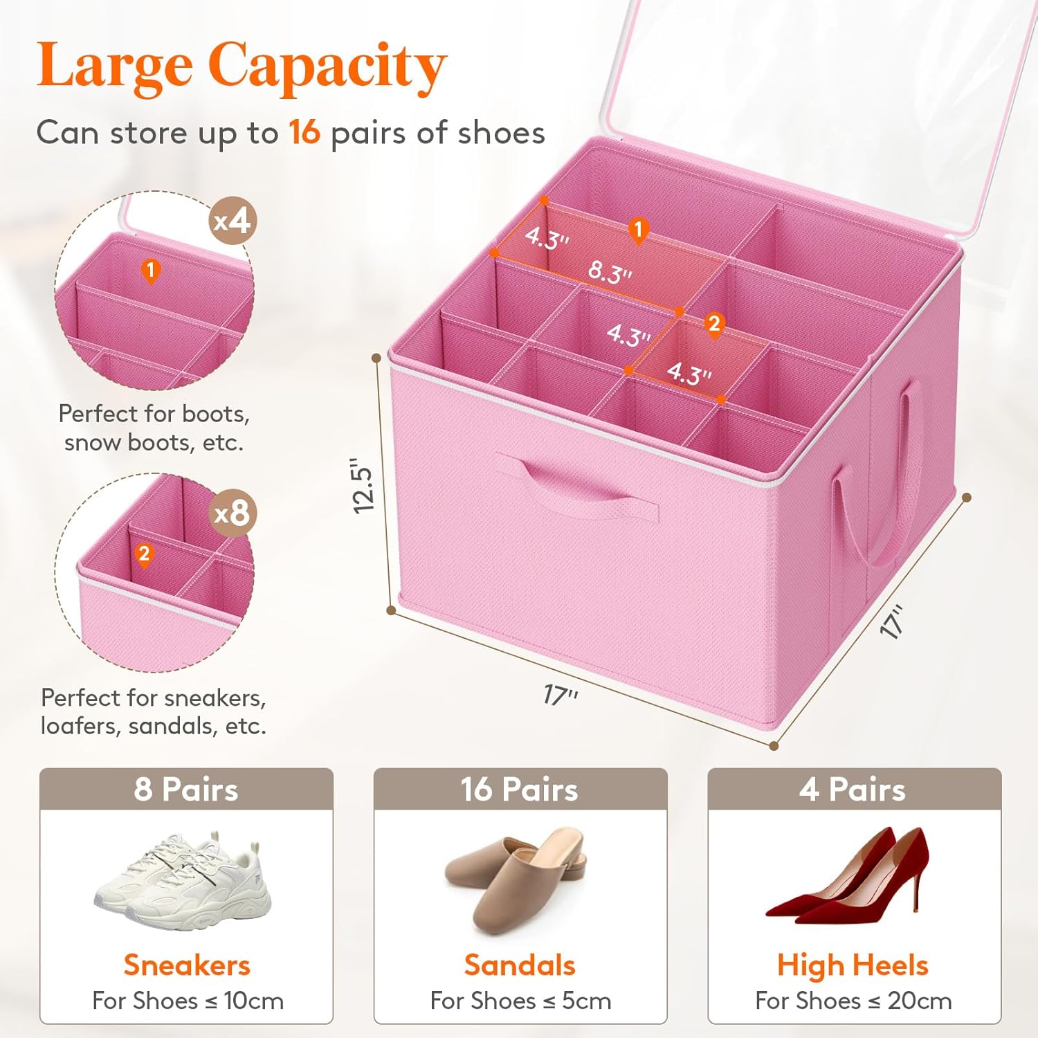 Lifewit Shoe Storage Organizer for Closet Fits 12-16 Pairs, Fabric Large Shoe Box Storage Containers with Clear Cover, Foldable Bins Fit for Boots Heels Sneakers 17"(L) x 17"(W) x 12.5"(H) 2 Pack Pink