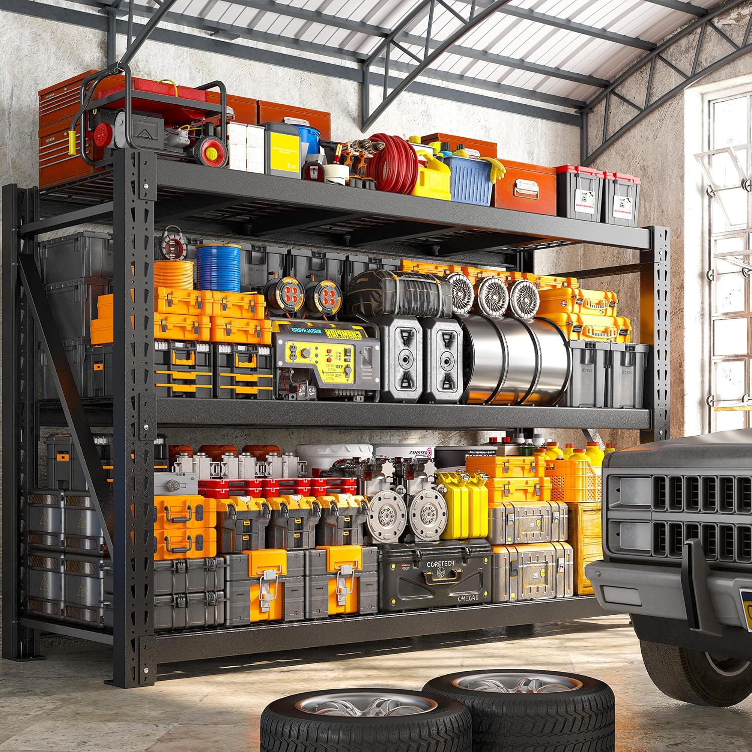 - 【Adustable Industrial Shelving】Heavy duty garage shelving with adjustable design, no need for tools to adjust the height of the tiers to DIY storage space, whether it's a large garage tools accessories or small items can be easily stored.