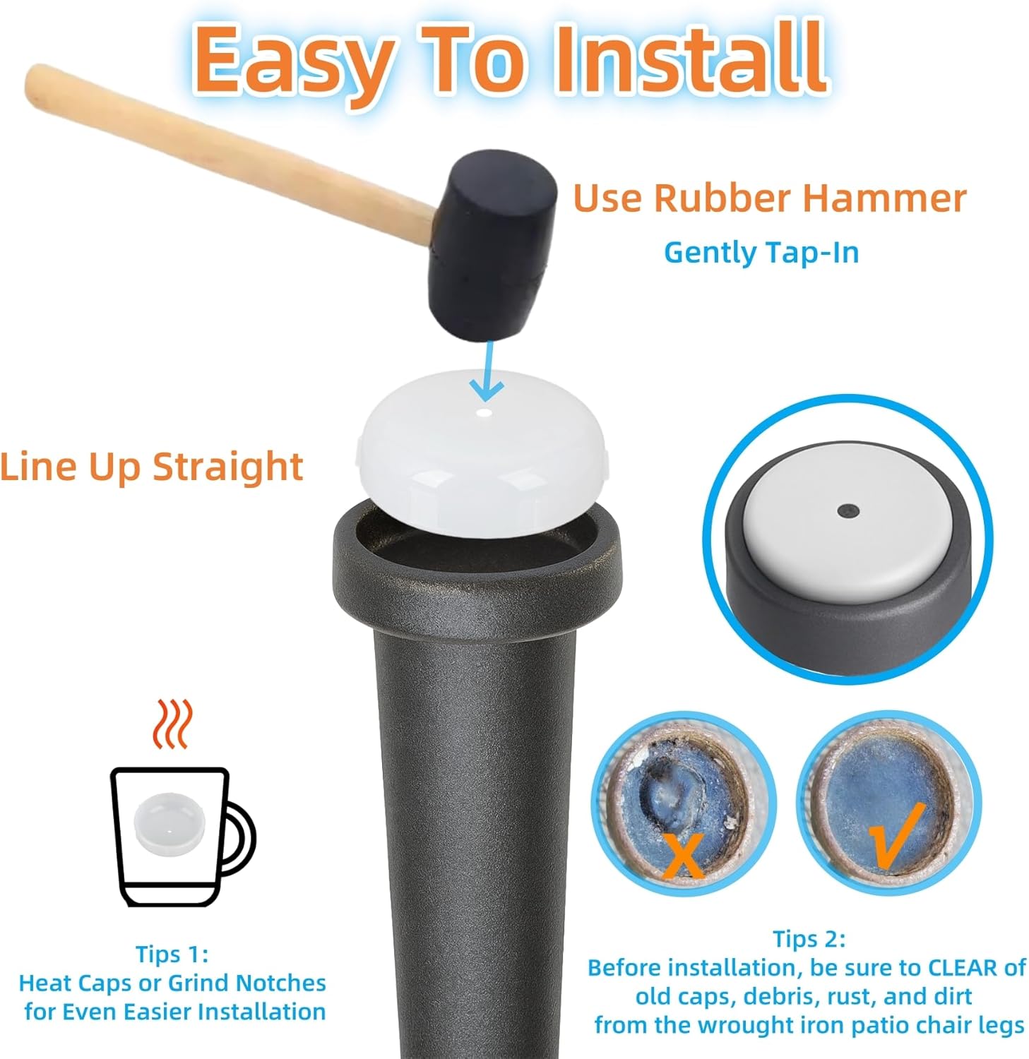 - Easy Installation, 24 Pack Value – Includes 24 patio chair feet caps for replacement glide caps of 6 chairs. Before installation, be sure to CLEAR of old caps, debris, rust, and dirt from the wrought iron patio chair legs, then tap the caps in with a rubber mallet. For even easier installation, heating the caps or grinding notches before fitting is recommended. These outdoor chair leg floor protectors provide lasting protection season after season.